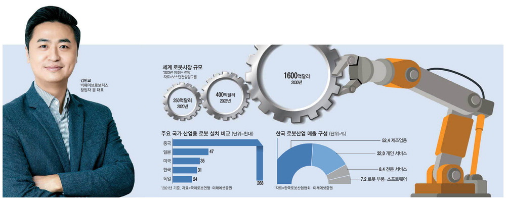 최근 매일경제와 만난 김민교 빅웨이브로보틱스 대표(사진)는 "로봇 대중화 시대가 이미 열렸다"고 강조했다. 그는 "제조 물류, 서비스 산업 전 분야에 걸쳐 인력난이 심화됨에 따라 로봇 도입 니즈가 크게 높아지면서 대중화 시대가 본격적으로 시작됐다"고 말했다. 로봇 도입 관련 문의도 빗발치고 있다. 빅웨이브로보틱스의 로봇 플랫폼의 월평균 문의 접수만 200건에 달할 정도다.