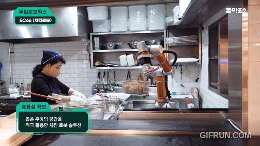 먼저 협동로봇은 사람 옆에서 반복적이고 위험한 업무를 대신 수행할 수 있어요. 예를 들어 치킨을 튀기는 공정 과정에서 치킨 반죽만 사람이 해주면 기름에 튀기는 일은 협동로봇이 대신할 수 있죠.