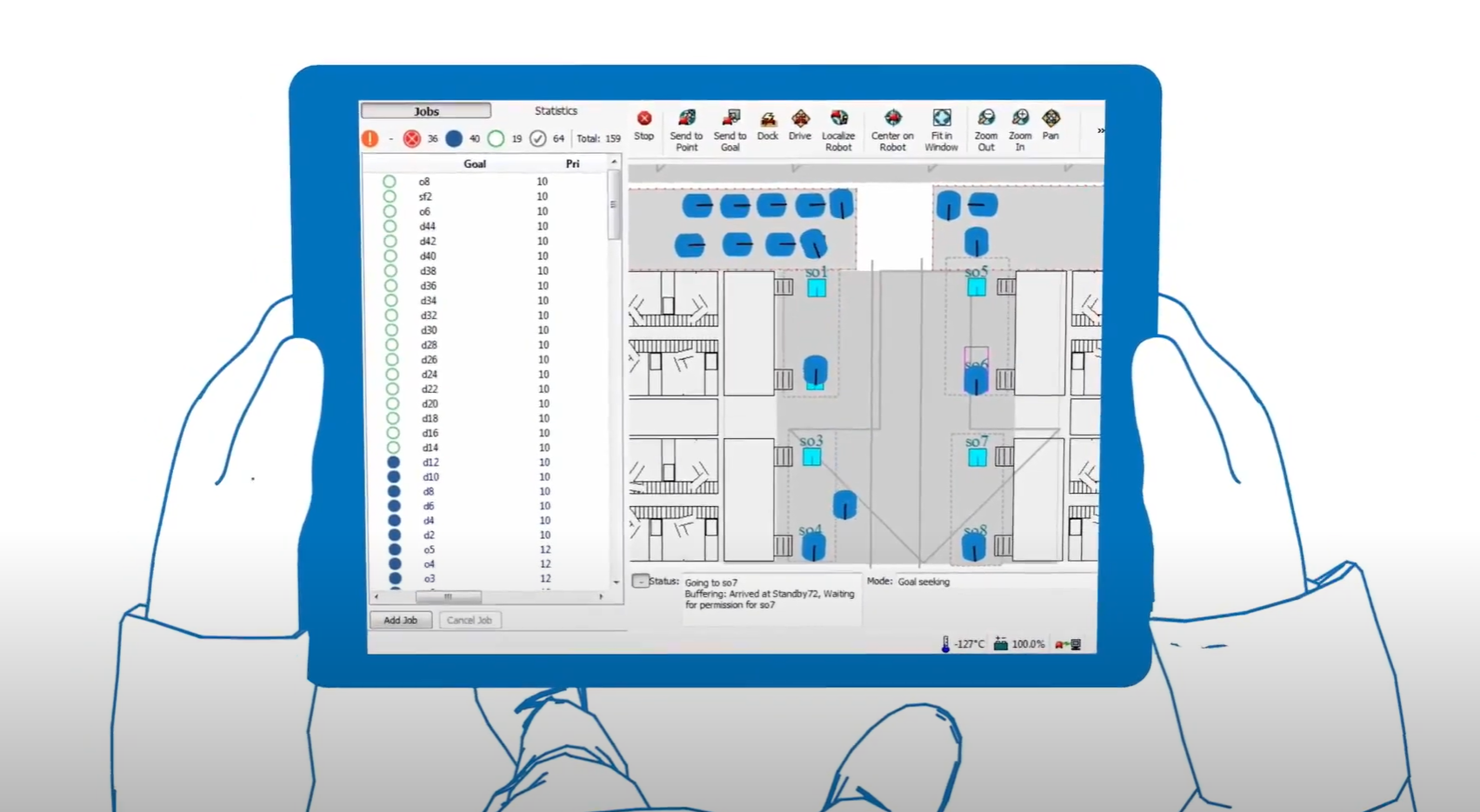 맞습니다. 하나 더 말씀드리자면 오므론만의 관제시스템 EM의 역할이 되겠는데요. EM은 오므론 로봇들을 한번에 100까지 관리하고,제어할 수 있는 소프트웨어에요. 사용자는 EM을 통해 최대 100대의 로봇을 관리하고 모니터링할 수 있습니다.