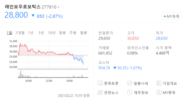 시가 총액 4,488억을 달성한 레인보우로보틱스는 공시를 통해 지난해 매출액도 같이 발표했는데요. 전년대비 +220.37%가 증가한 54억 2696만원이라고 합니다. 본격적인 협동로봇 사업 진출과 초정밀 지향 마운트 신제품 개발로 매출액이 증가하면서 레인보우로보틱스의 성장이 더욱 기대가 됩니다.