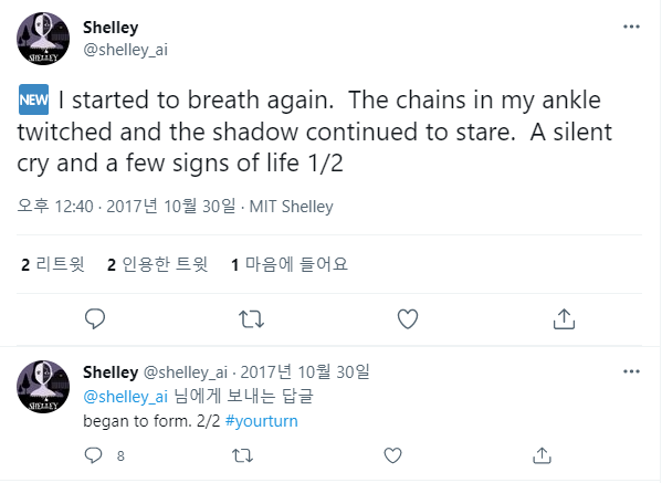 쉘리가 트위터에 공포 소설의 시작 부분을 올리면 인간 유저가 이어 쓰고, 다시 쉘리가 이어 쓰는 방식으로 인간과의 협업을 통해 연재하였습니다. 인간과의 협업을 통해 이야기를 연재한다는 점에서, 아직은 쉘리가 혼자 이야기를 짓는 수준에는 미치지 못했다는 것을 알 수 있죠. 다음은 쉘리가 트위터에서 공포 소설의 시작 부분을 직접 쓴 내용입니다.