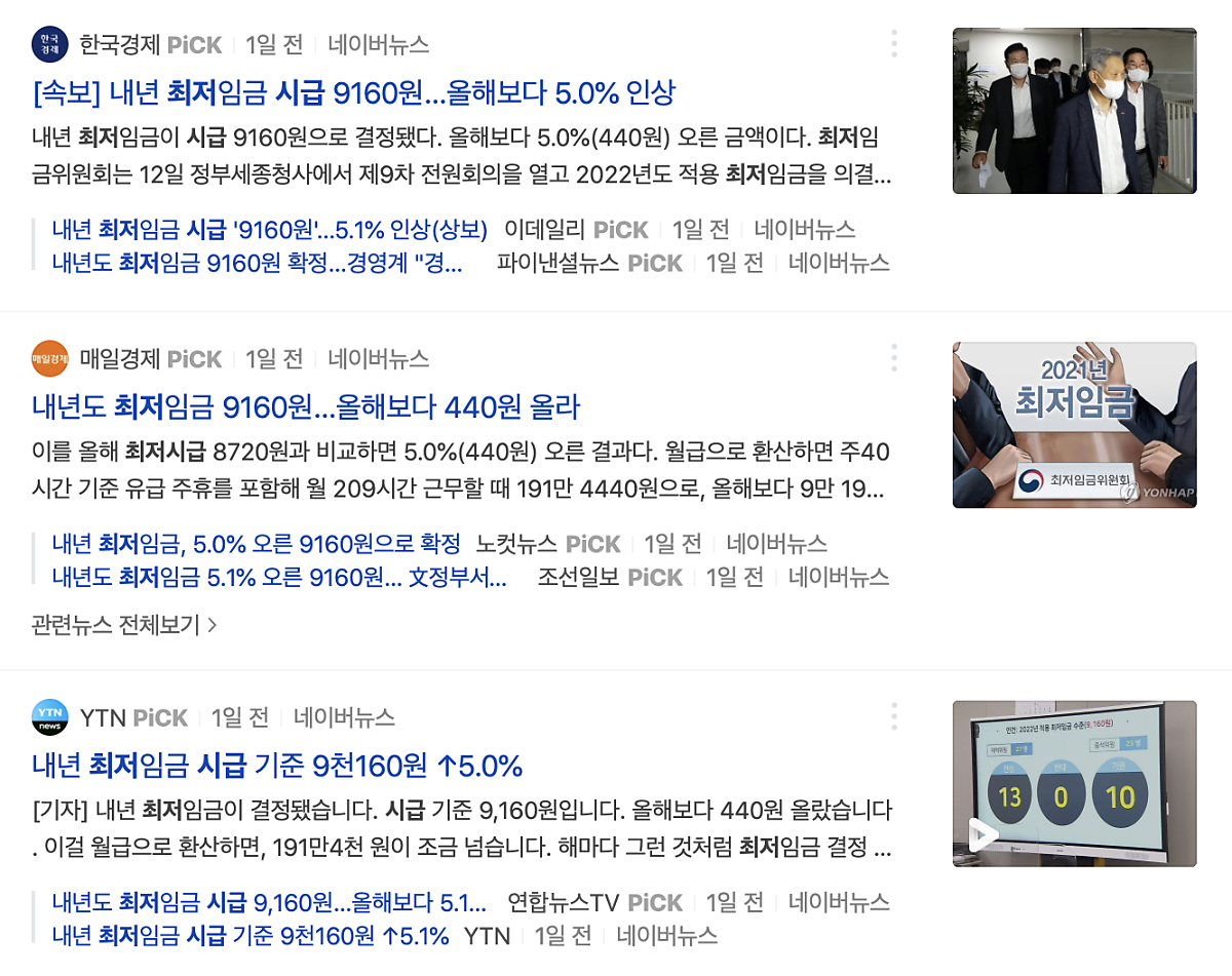 2021년도 벌써 절반이 지난 지금, 내년도인 2022년 최저 임금 시급이 무려 5.0% 인상된 9,160원으로 결정되었습니다. 이번 결정 역시 노동계와 경영계는 합의에 실패하고 근로자위원과 사용자위원 동시 퇴장이라는 우여곡절 끝에 표결로 결정되었는데요. 최저 임금 시급 9,160원을 월급으로 환산하면 약 191만 4천원이 조금 넘습니다.