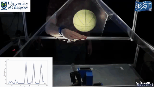 상황에 따라서는 손동작이나 거리 따라 공기의 압력을 조절해 더욱 사실적인 느낌을 전달하는 것도 가능합니다. 예를 들면 손이 멀리 있어도 같은 압력을 받을 수 있는 것이죠. 뿐만 아니라 농구공 홀로그램을 튕겼을 때 공의 둥근 모양새와 튀기는 강도까지 느낄 수 있어서 실제 농구공을 튀길 때와 매우 비슷한 느낌을 받았다고 합니다.
