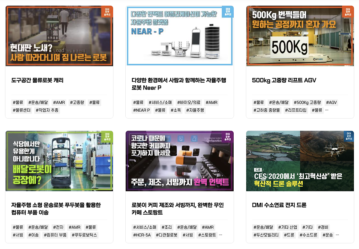 그래서 다양한 로봇 자동화 현장을 직접 영상으로 살펴보고 전문가의 상담 및 견적까지 무료로 한번에 받을 수 있는 '마로솔' 서비스에도 다양한 운반 자동화 사레들을 만나보실 수 있는데요. 그 중에서도 특히 중대재해법의 영향을 받아서 그런지, 공장에서 부자재나 완성품을 옮기는 환경에서 로봇을 도입하고 싶다는 분들이 최근들어 더욱 급속도로 증가하고 있다고 합니다.