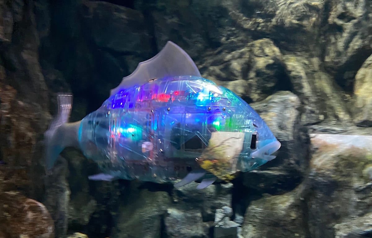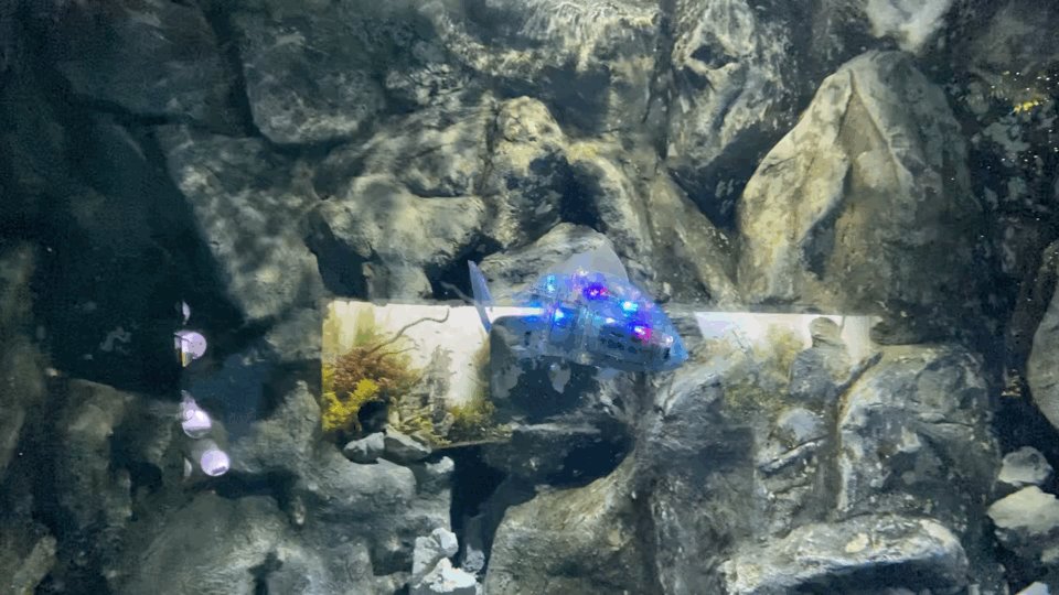 LED 빛을 내며 헤엄치는 로봇 물고기 '마이로'의 모습