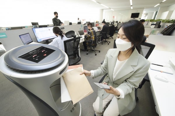 이렇게 사무실에 방역 로봇을 운행하고 있는 KT에서 이번에는 로봇 집배원을 선보였습니다. 이 집배원 로봇 역시 KT 광화문 이스트 사옥에서 활동하고 있는데요. 기존에는 우편 지원 센터의 직원이 사내 직원들에게 배송 도착 알림 메일을 보내고 직원이 직접 지원 센터에 방문해 물품을 수령해 갔어야 했지만, 이번에 도입된 AI 로봇을 통해 센터에 방문할 필요 없이 자리에서 그대로 우편물을 수령할 수 있게 되었습니다.