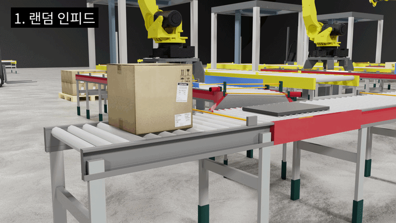| STEP 1. | 랜덤 인피드 구간으로 규격이 서로 다른 다양한 제품이 혼합된 상태로 유입 |