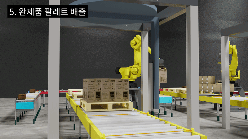 | STEP 6. | 산업로봇은 공급된 팔레트 위에 사전에 설정된 팔레트 패턴에 맞춰 제품을 적재 |