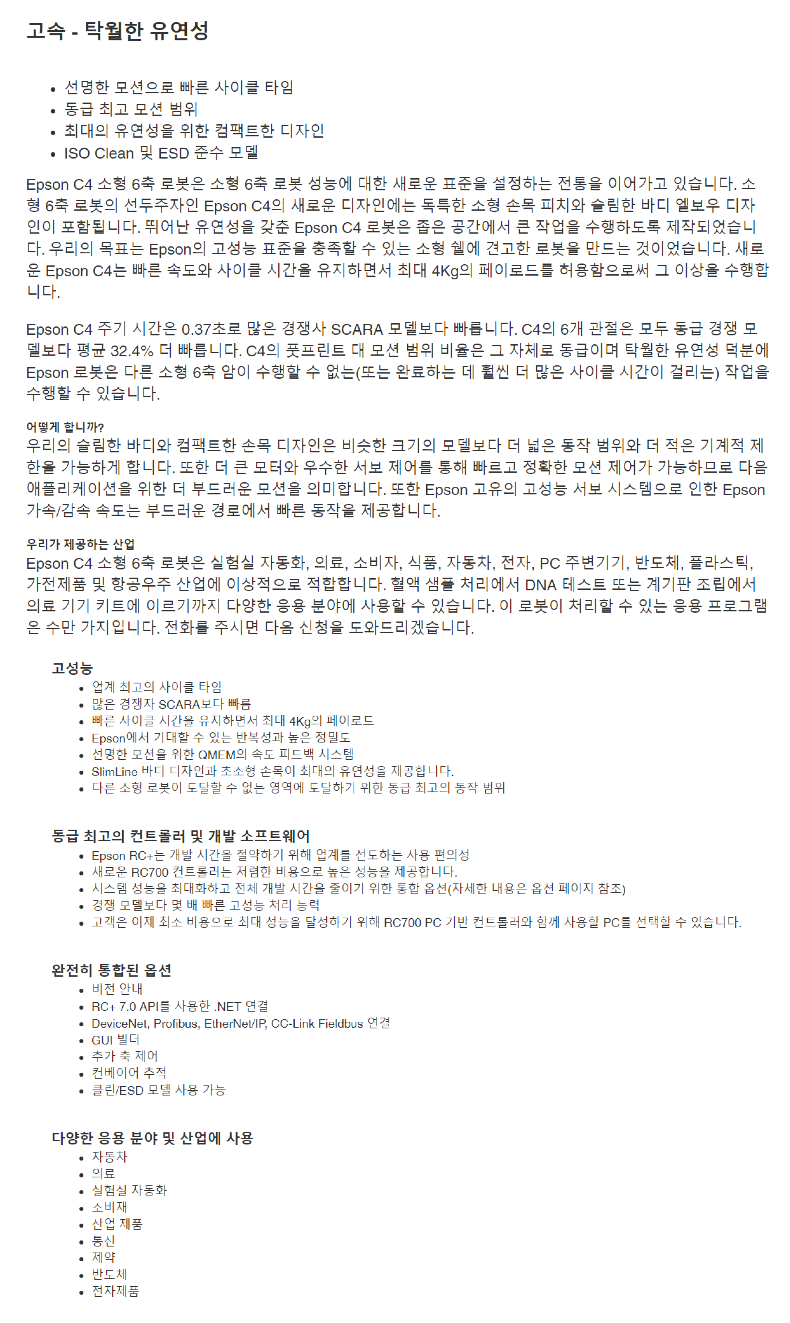 | 상품명(모델명) | EPSON C4 Compact 6-Axis Robots (Payload : 4 kg, Reach : 665mm) | ||