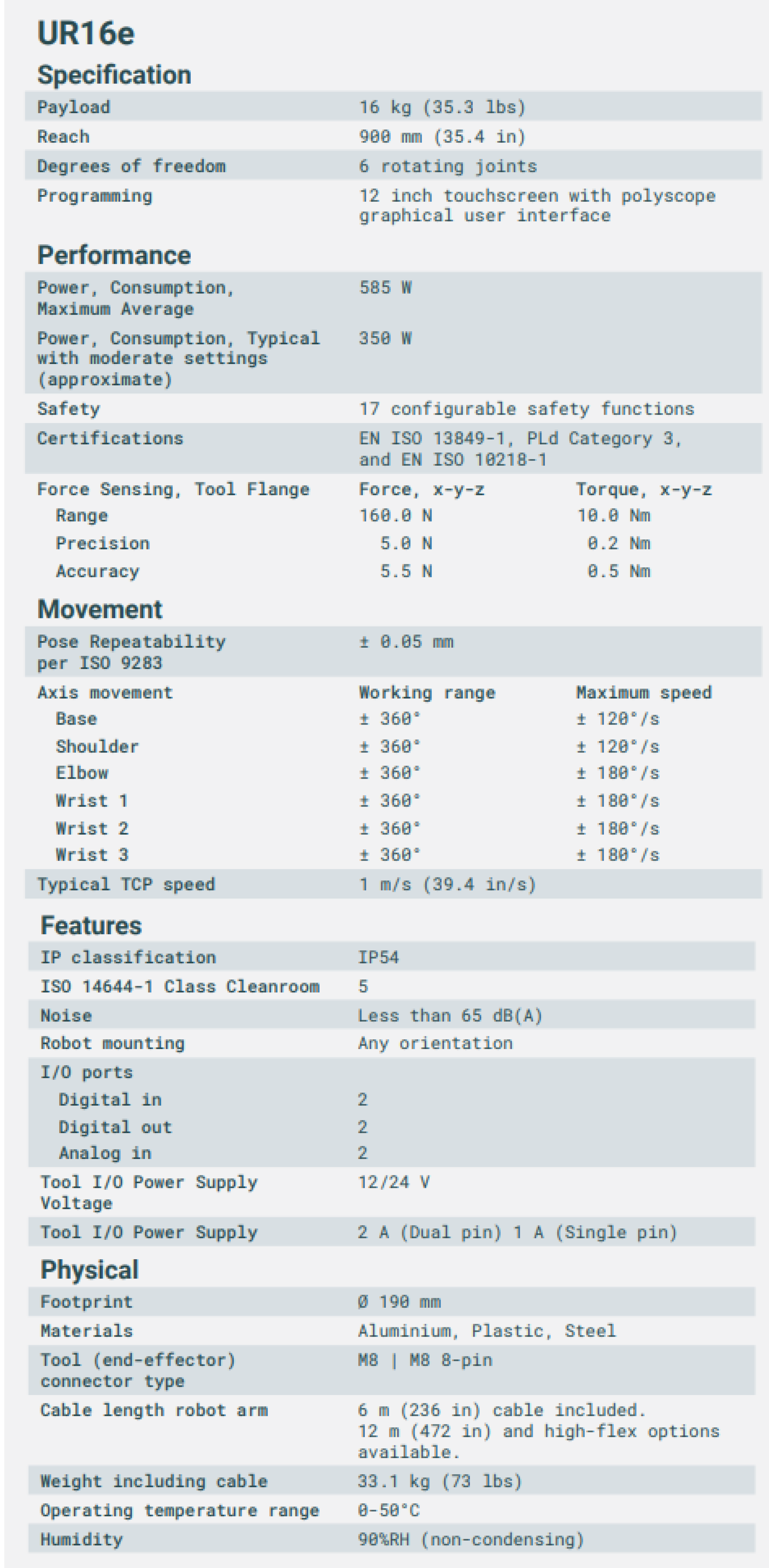 The UR16e delivers 16 kg of payload, allowing for heavier end of arm tooling and multi-part handling.