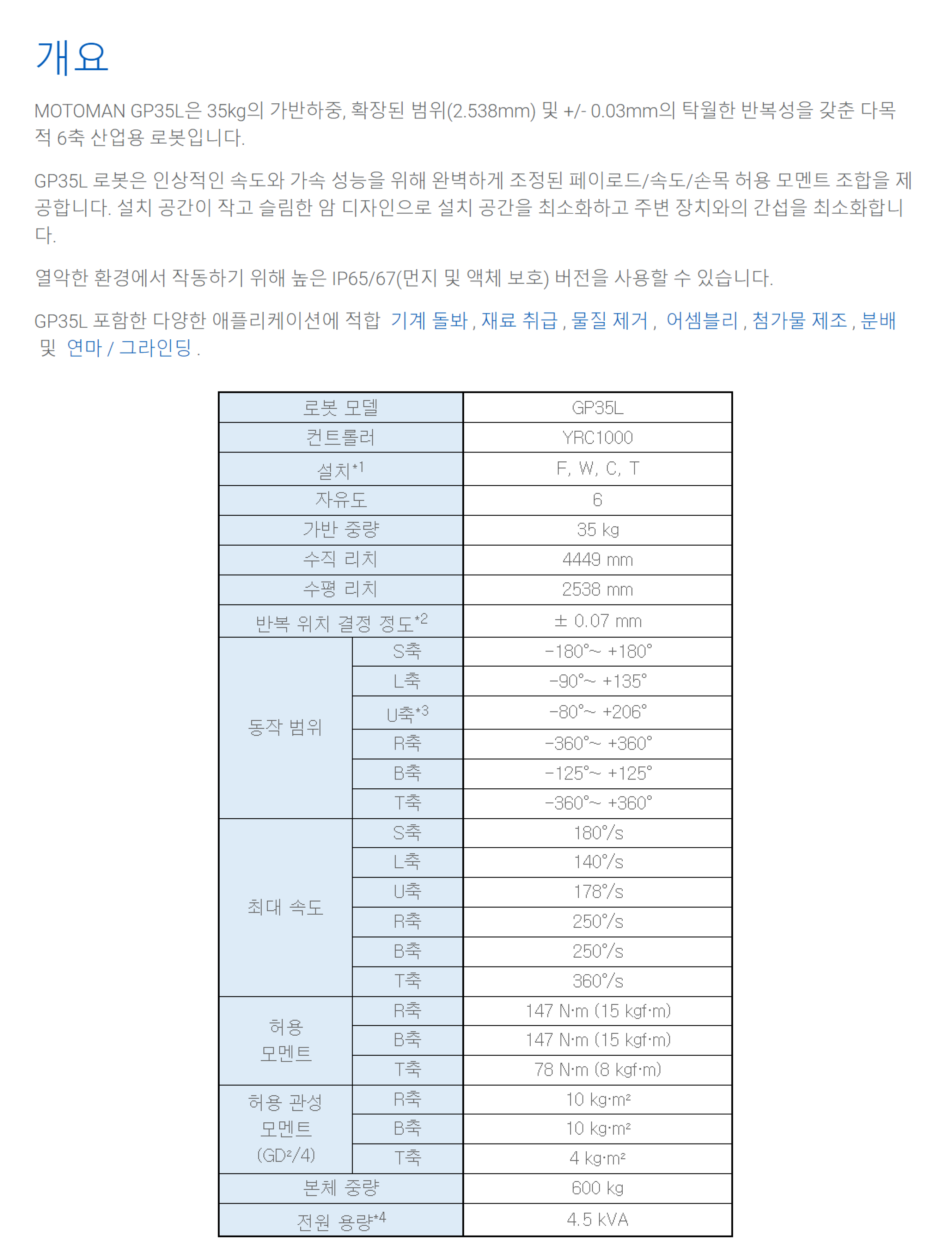 | 상품명(모델명) | YASKAWA GP35L (Payload : 35kg, Reach : 4449mm) | ||