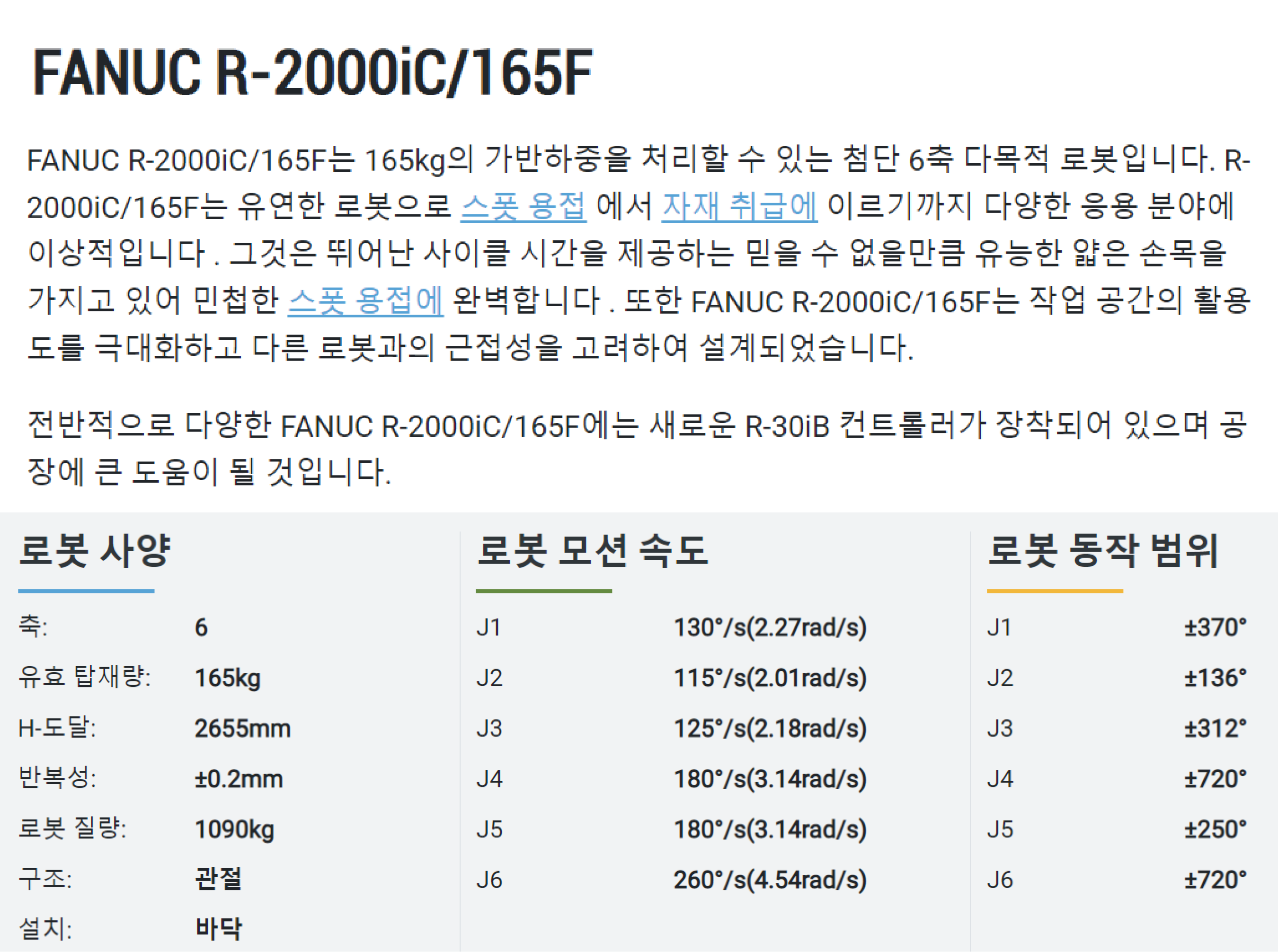 | 상품명(모델명) | FANUC R-2000iC (Payload : 165kg, Reach : 2655mm) | ||
