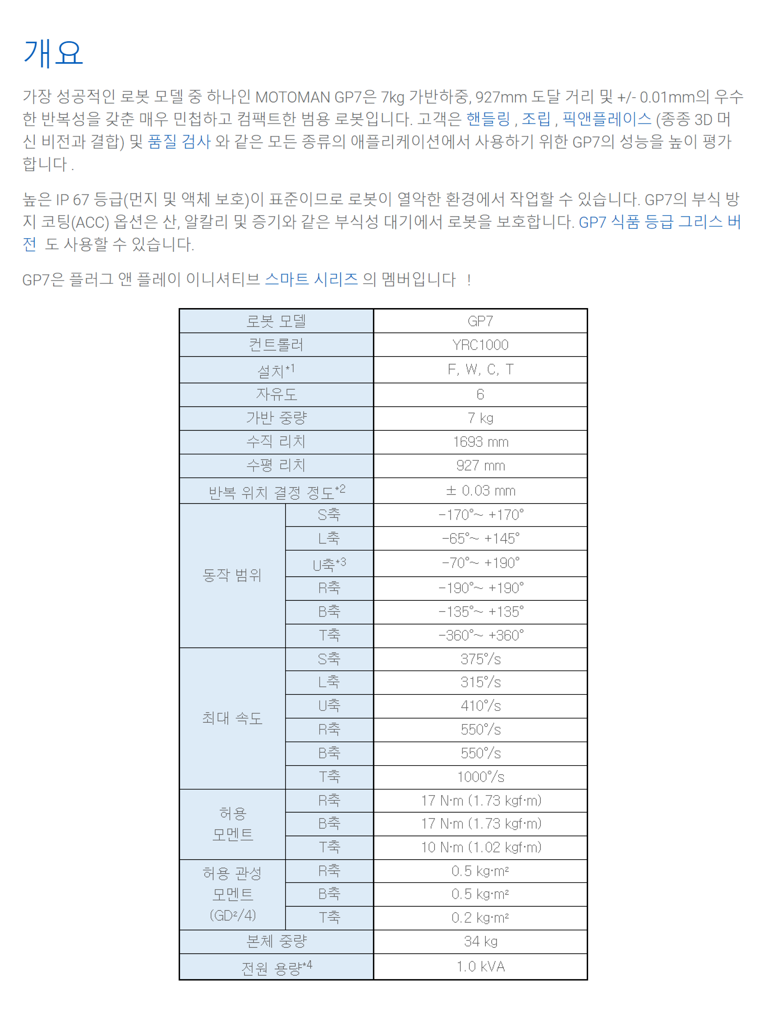| 상품명(모델명) | [업계 최저가] YASKAWA GP7 (Payload : 7kg, Reach : 1693mm) | ||