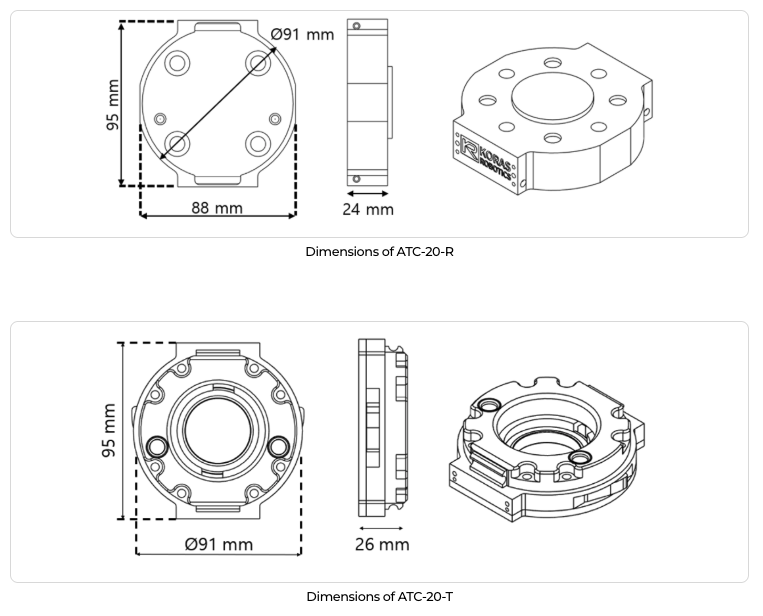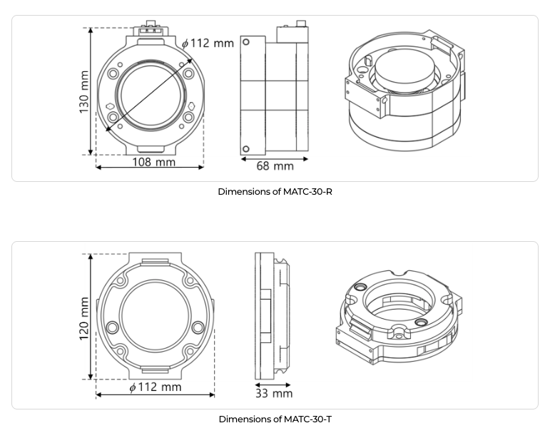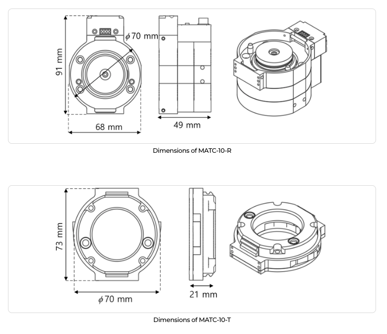 - MATC에 호환되는 툴/그리퍼는 자체 구동부가 필요 없고, 단지 기구부만으로 구성되므로 가격이 저렴하고, 사용자가 구동부에 대한 부담 없이 직접 제작하여 사용하는 것도 가능함.