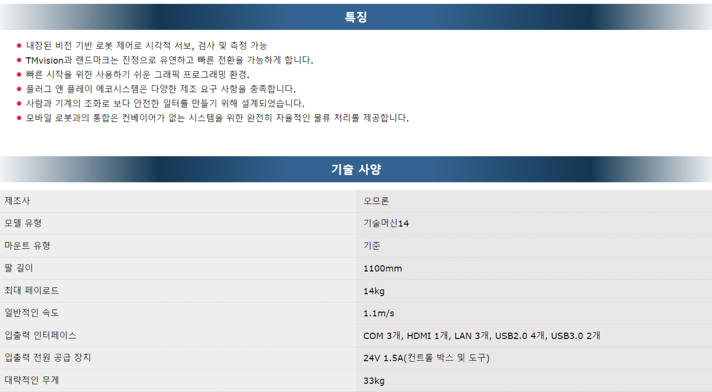 | 상품명(모델명) | OMRON TM14 (Payload: 14 kg, Reach: 1100 mm) | ||