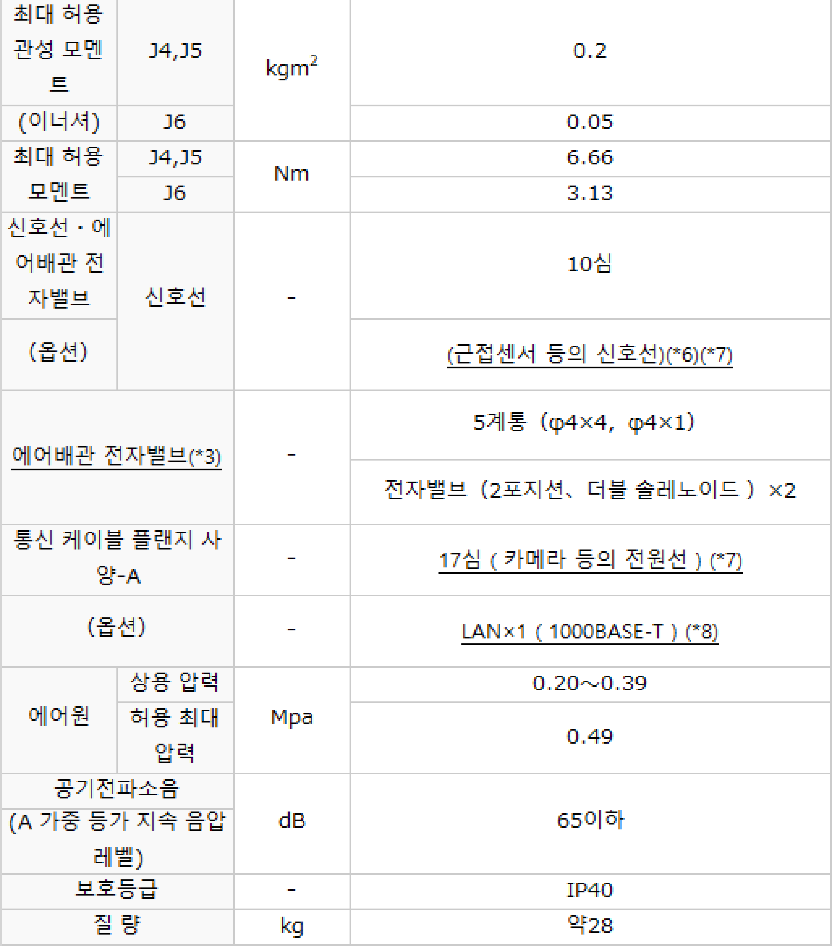 | 가반하중(Kg) | 4 | 작업반경(mm) | 605 |