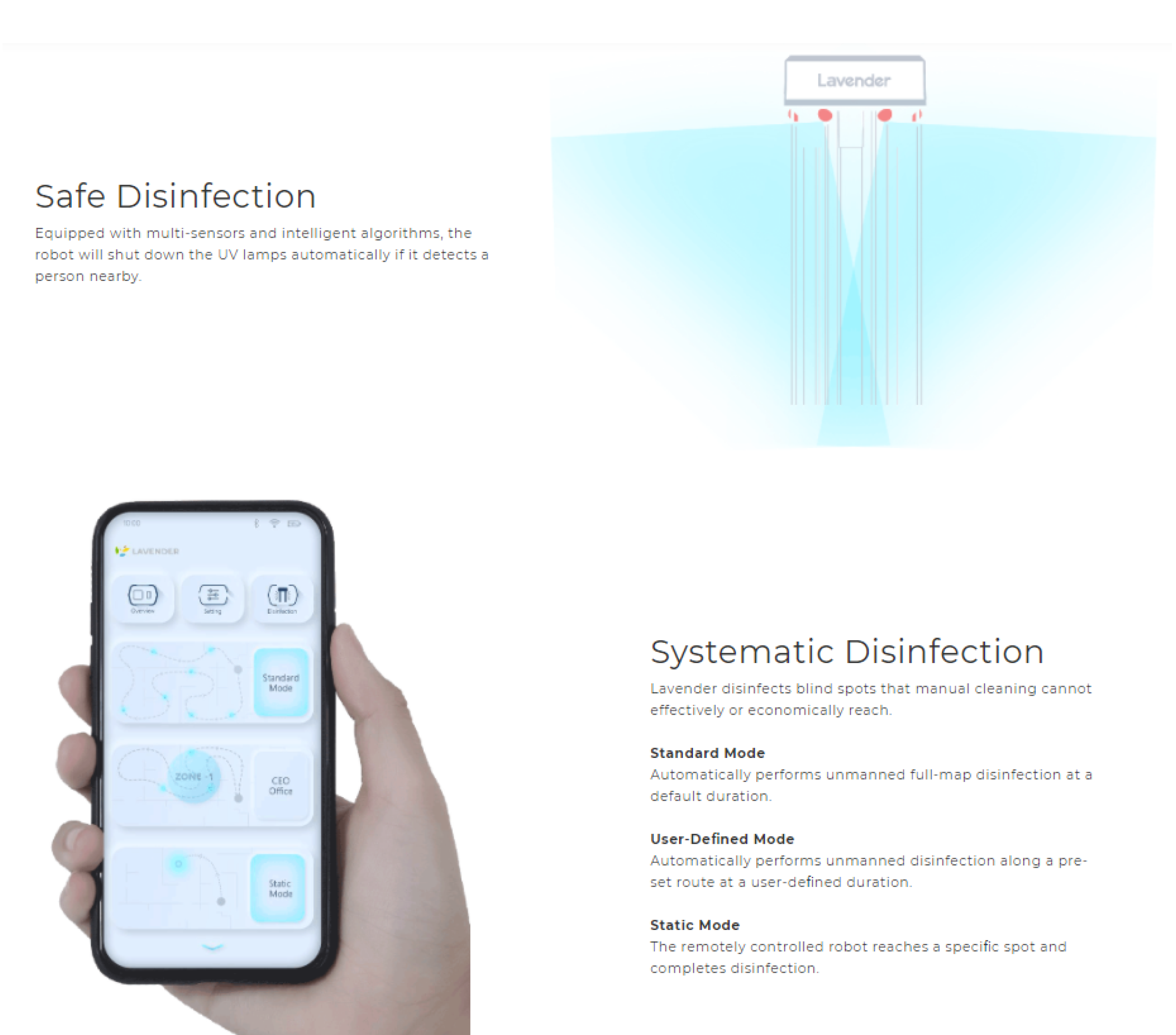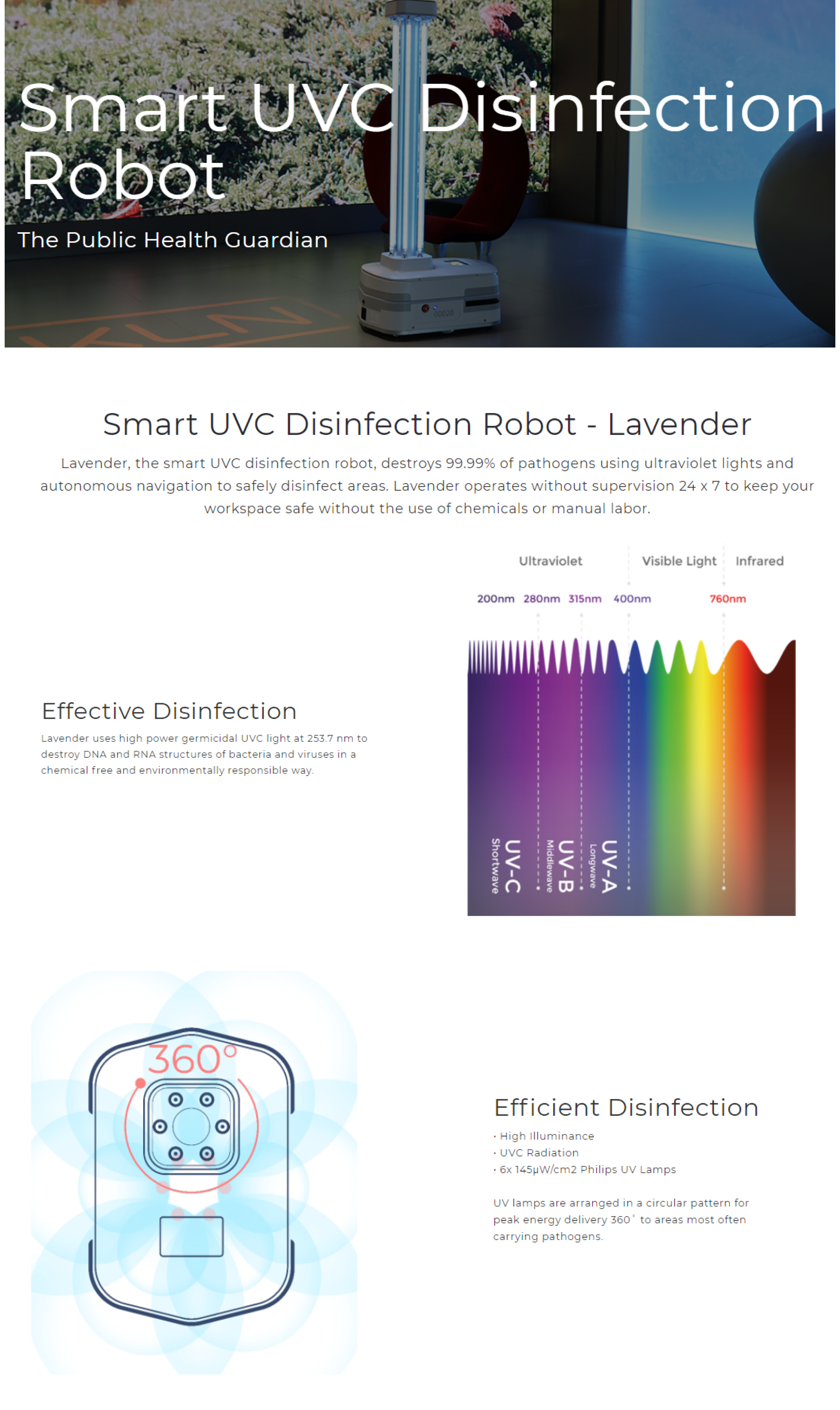 the smart UVC disinfection robot, destroys 99.99% of pathogens using ultraviolet lights and autonomous navigation to safely disinfect areas.