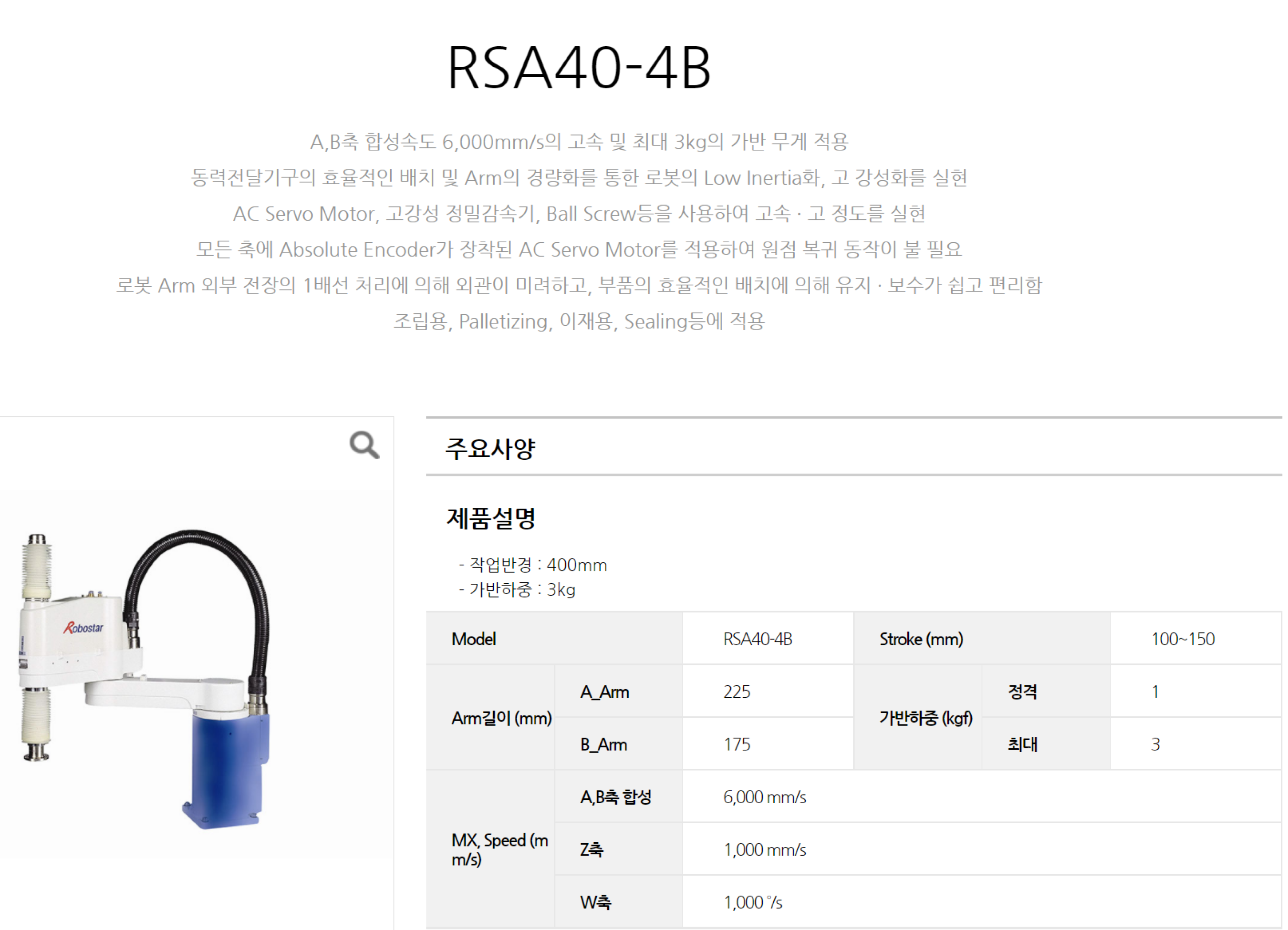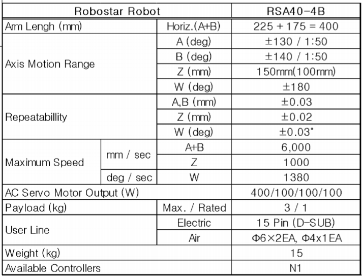 | 상품명(모델명) | 로보스타 RSA40-4B (Payload : 3kg, Reach : 400mm) | ||