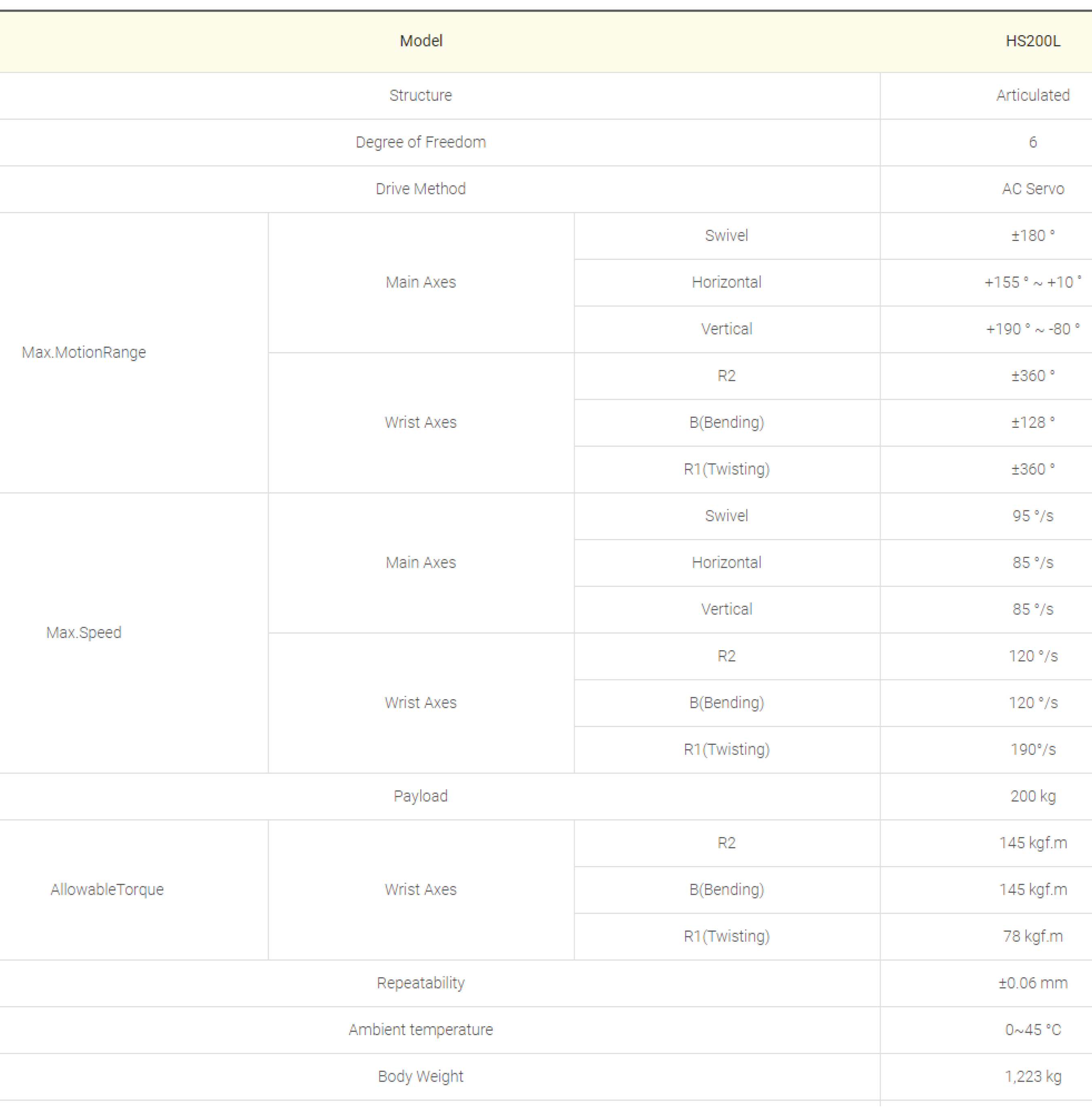| 상품명(모델명) | 현대로보틱스 HS200L(HDR200L-30) (Pay load : 200kg Reach : 3,070mm) | ||