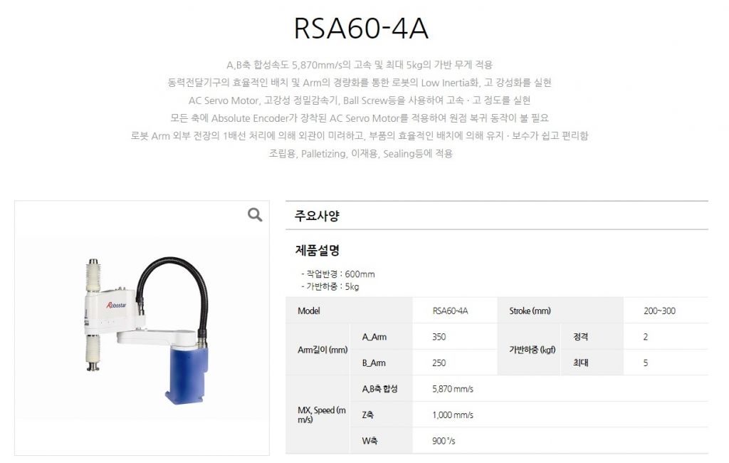 | 상품명(모델명) | 로보스타 RSA60-4A (Payload : 5 kg, Reach : 600 mm) | ||