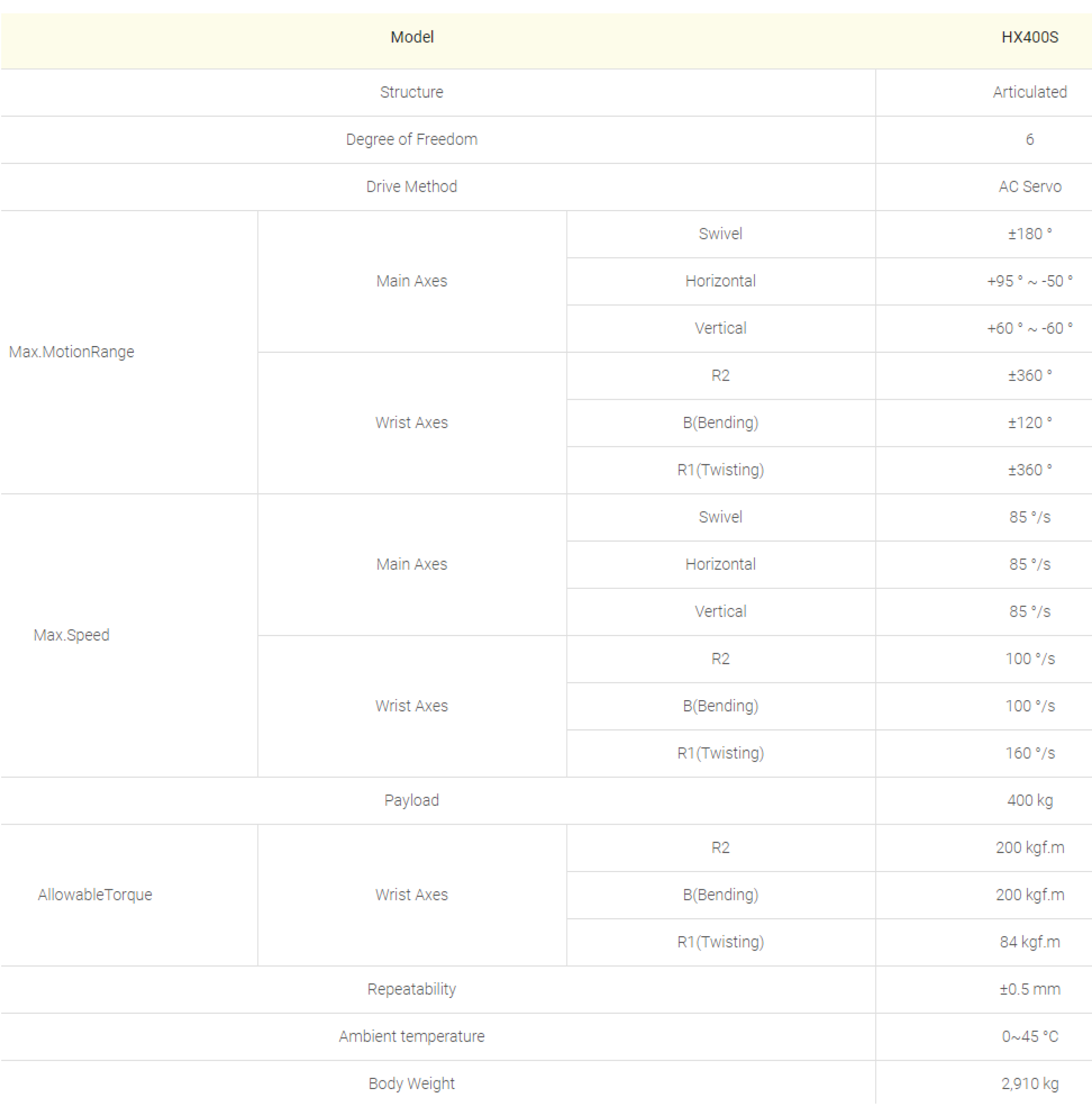 현대로보틱스 HX400S (Pay load : 400kg Reach : 3,106mm)