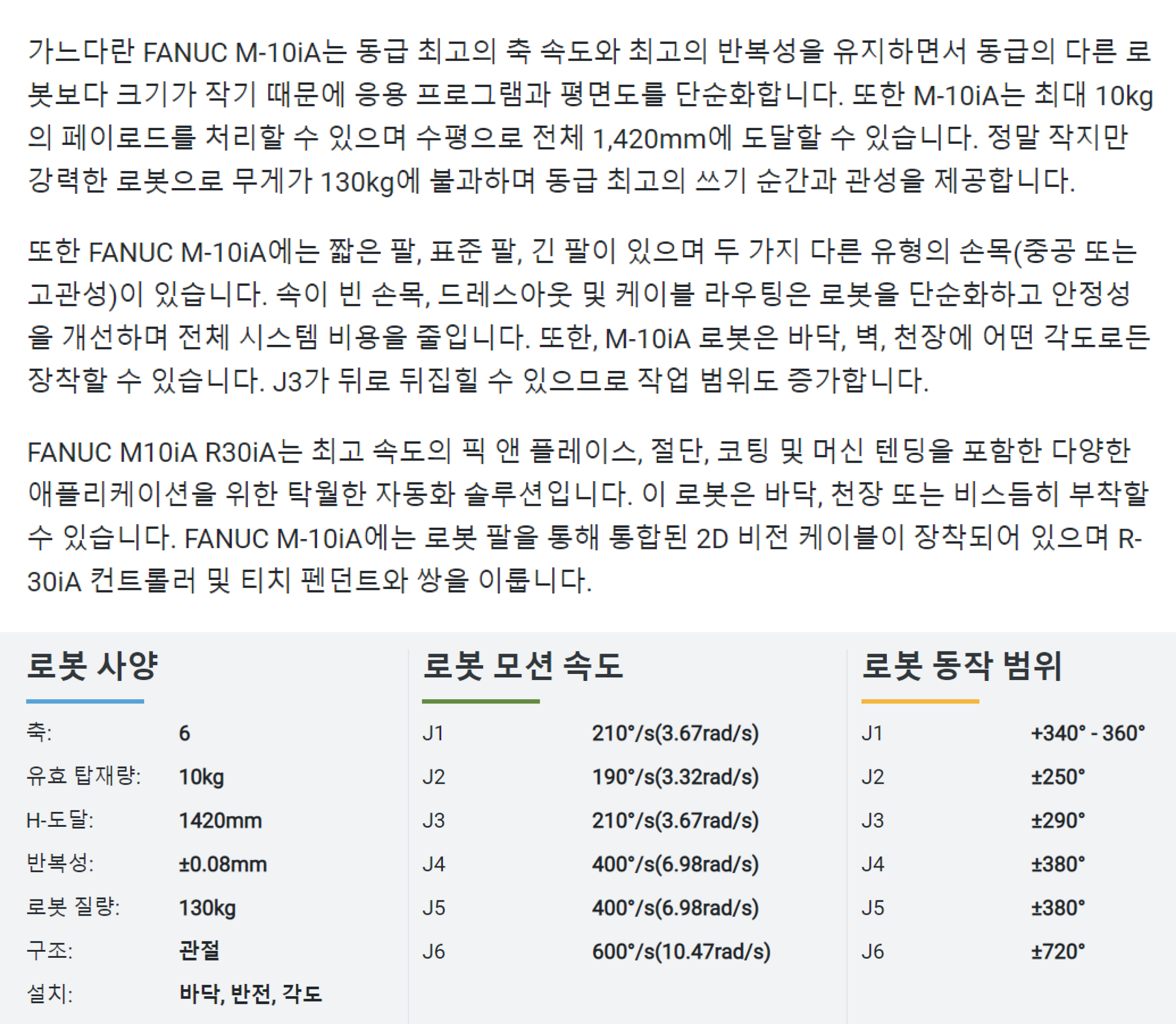 | 상품명(모델명) | FANUC M-10iA (Payload : 10kg, Reach : 1420mm) | ||