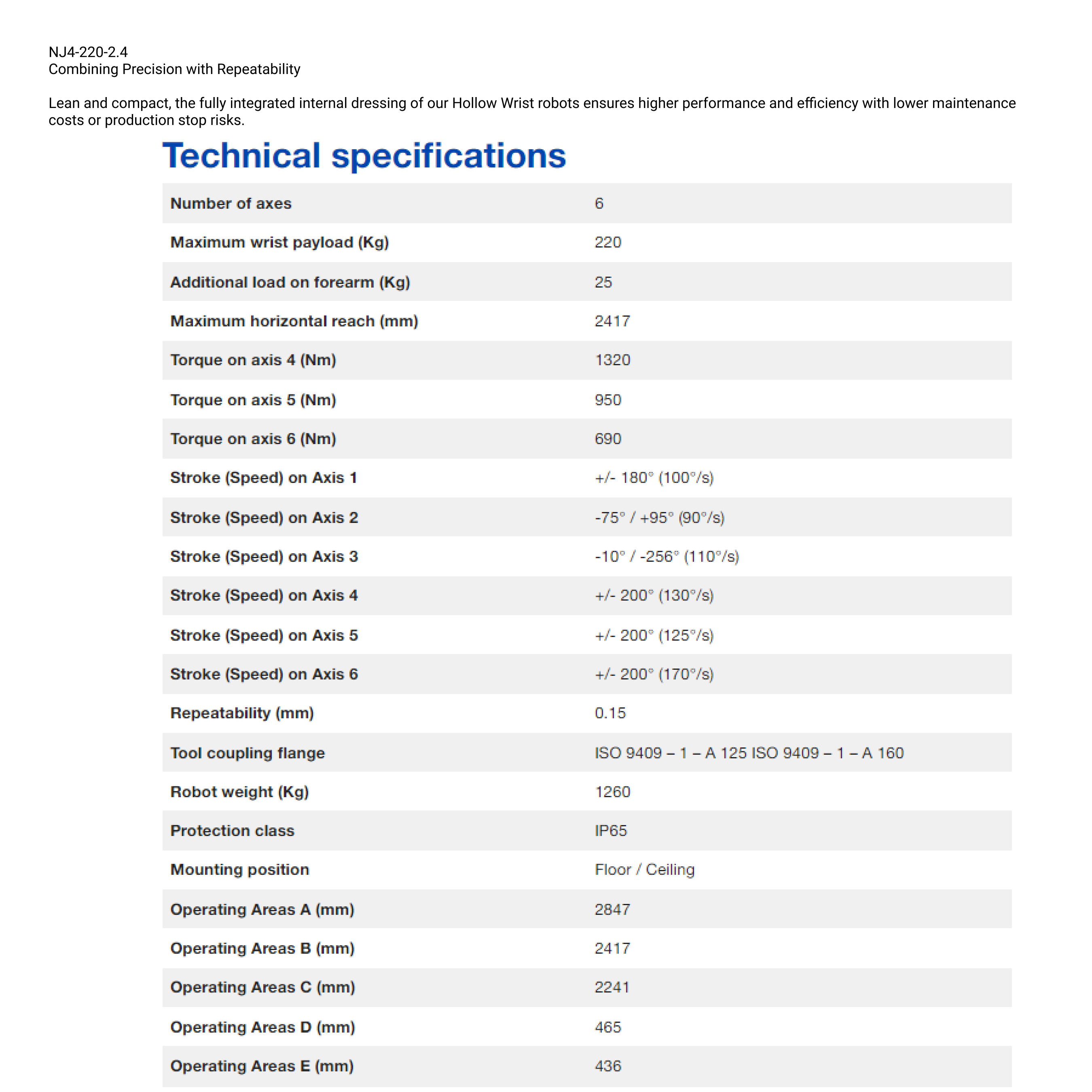 | 상품명(모델명) | Comau NJ4-220-2.4 (Payload : 220kg, Reach : 2417mm) | ||