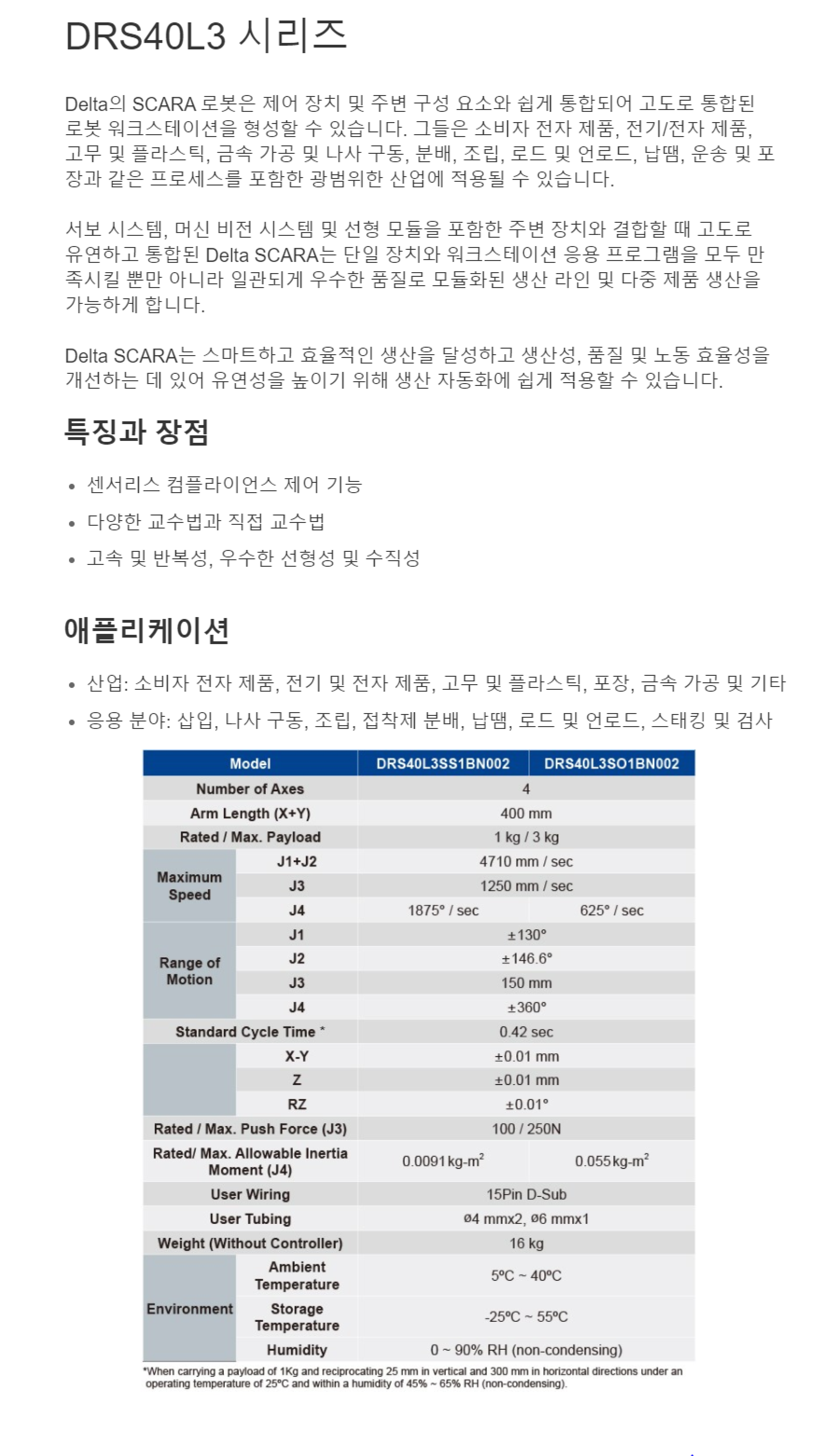 | 상품명(모델명) | DELTA DRS40L3 (Payload : 3kg, Reach : 400mm) | ||