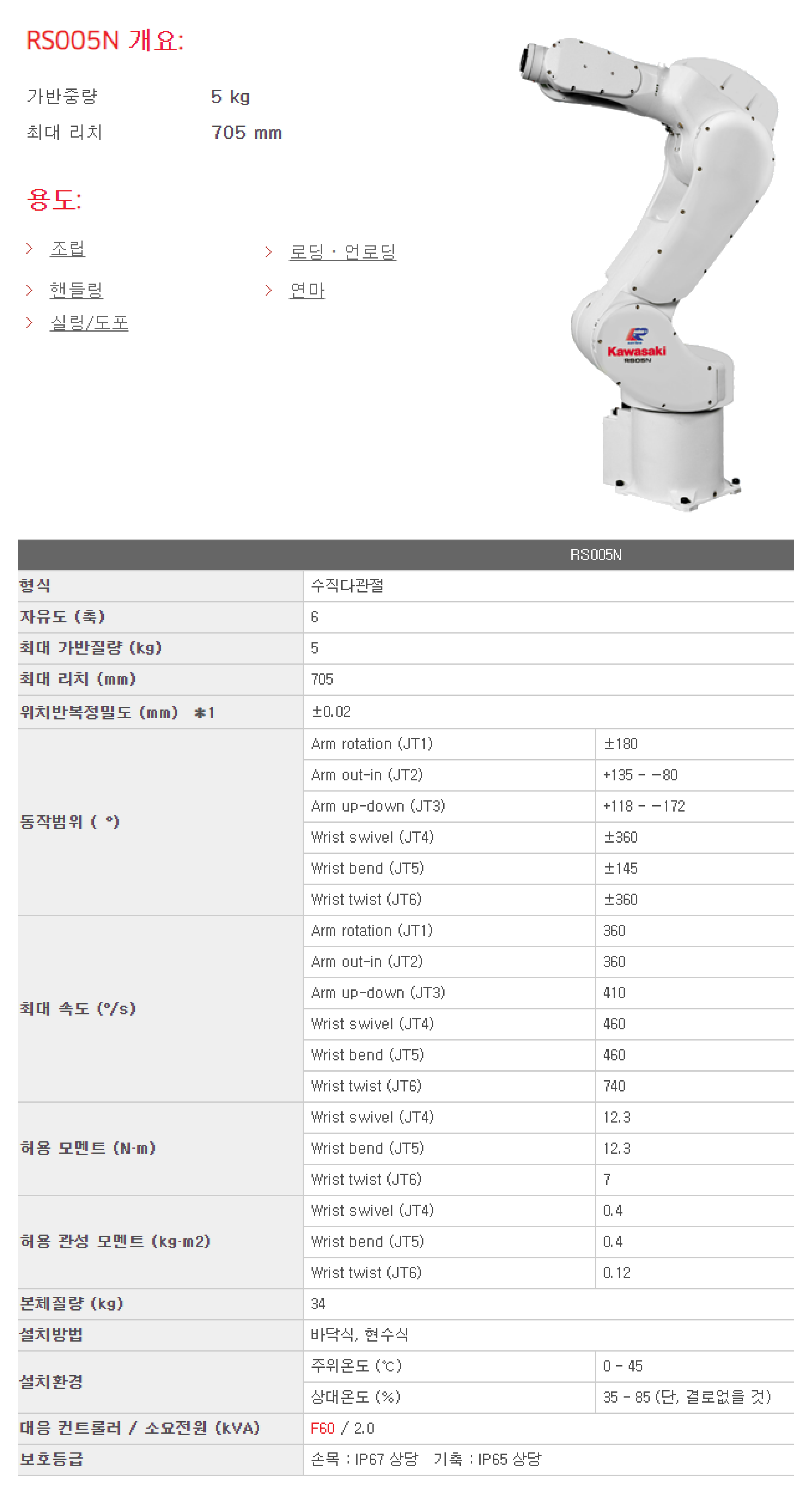 | 상품명(모델명) | Kawasaki 중소형 범용 로봇 RS005N (Payload : 5 kg , Reach: 705 mm) | ||