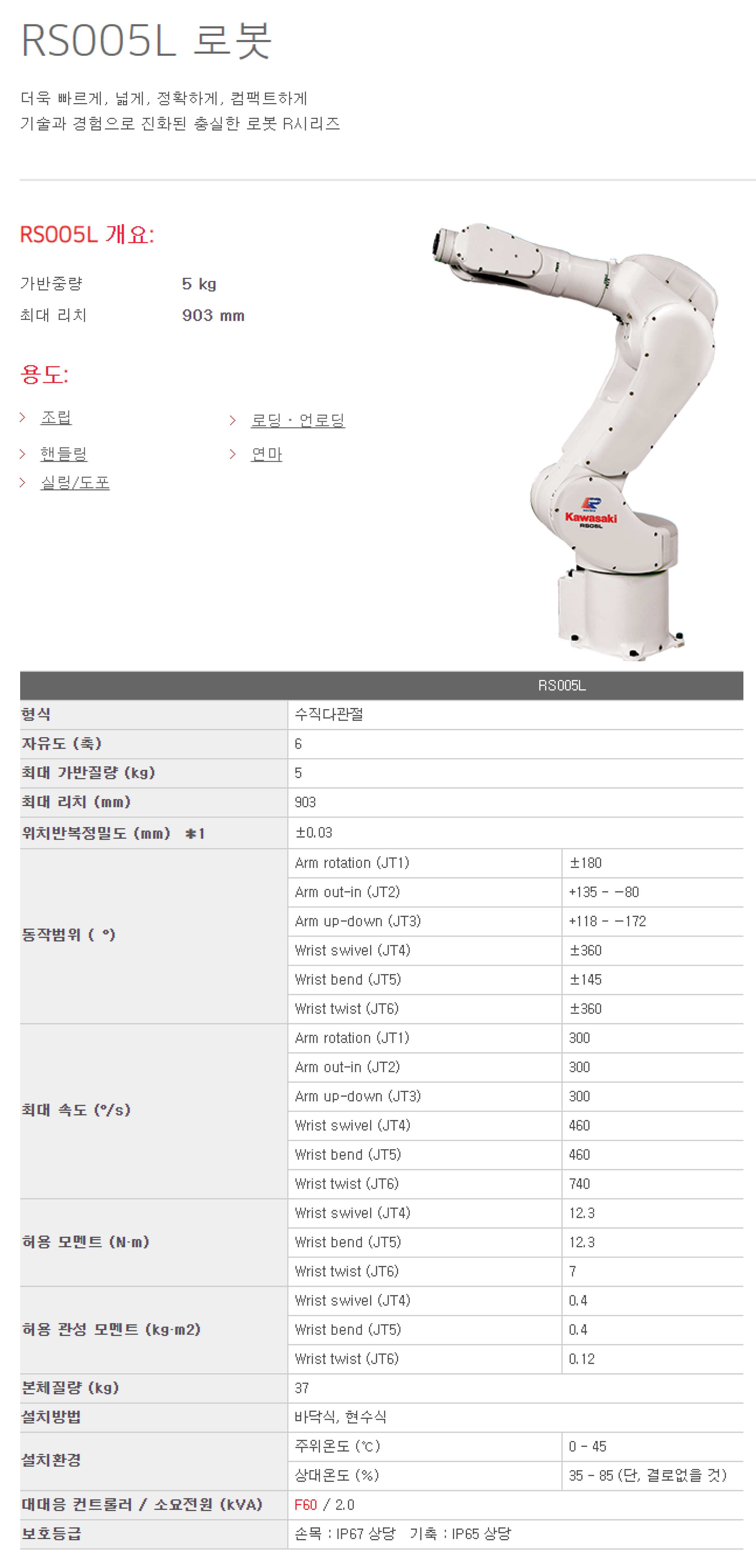 | 상품명(모델명) | Kawasaki 중소형 범용 로봇 RS005L (Payload : 5 kg , Reach: 903 mm) | ||