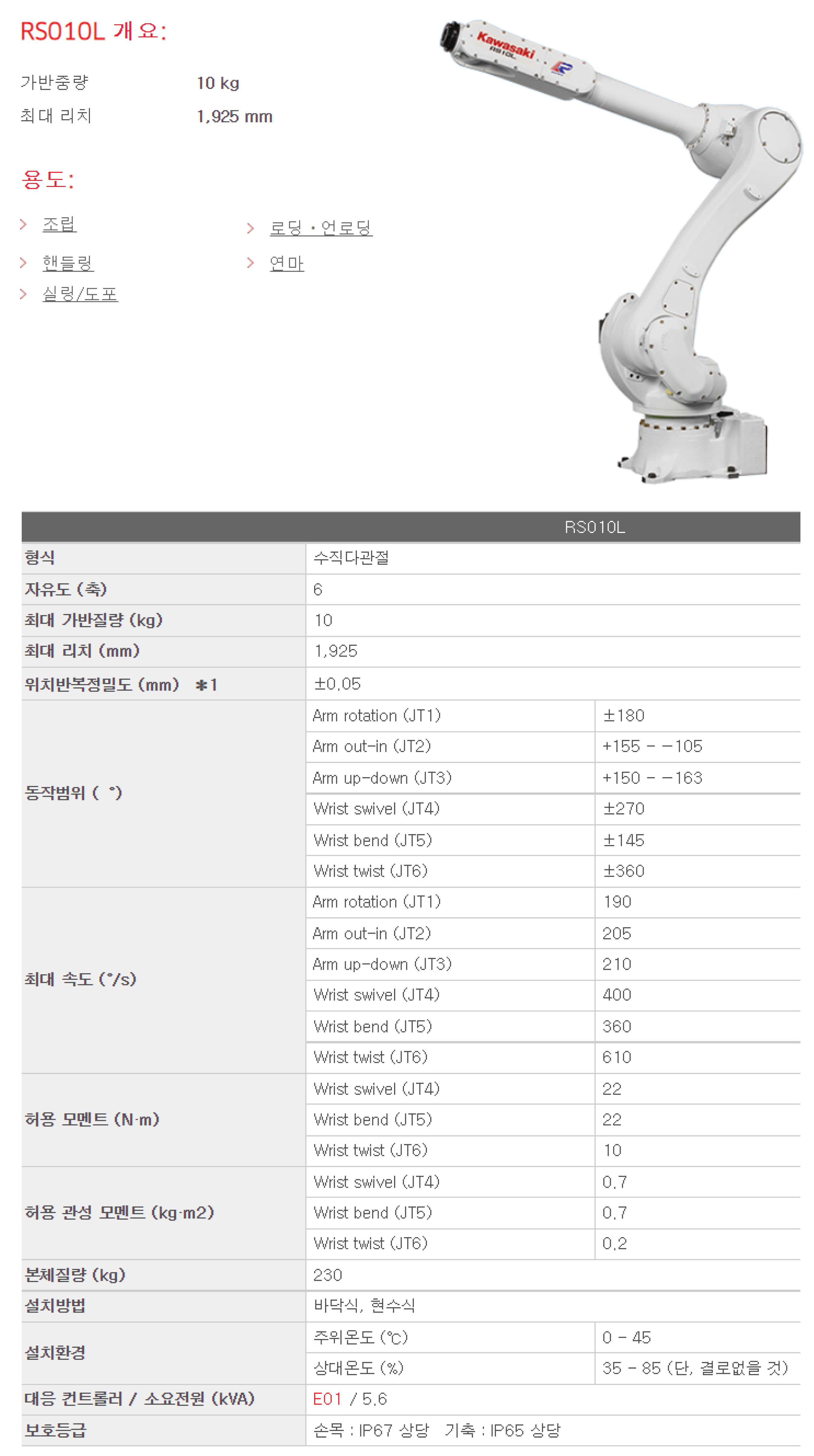 | 상품명(모델명) | Kawasaki 중소형 범용 로봇 RS010L (Payload : 10 kg , Reach: 1,925 mm) | ||