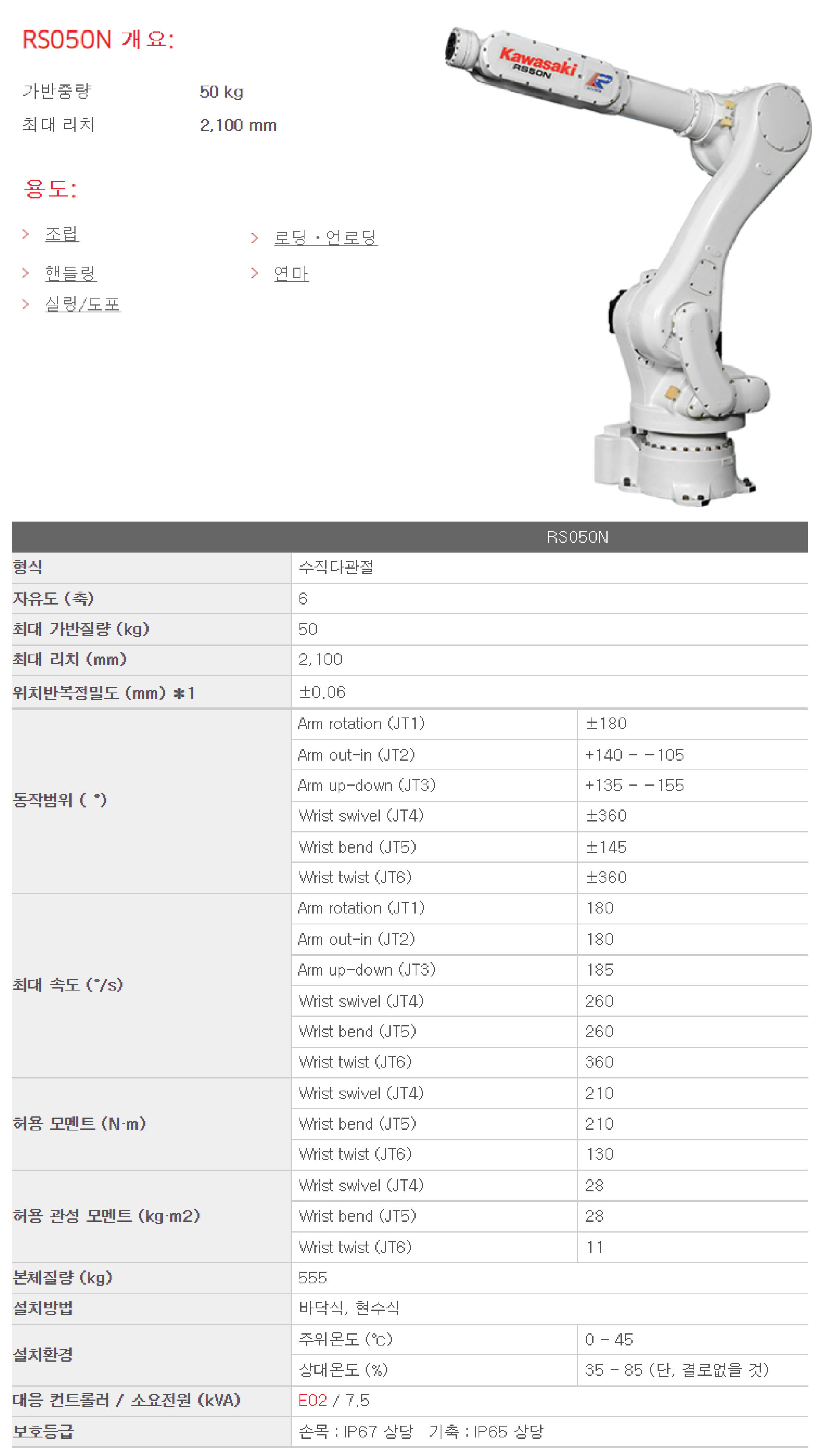 | 상품명(모델명) | Kawasaki 중소형 범용 로봇 RS050N (Payload : 50 kg , Reach: 2,100 mm) | ||