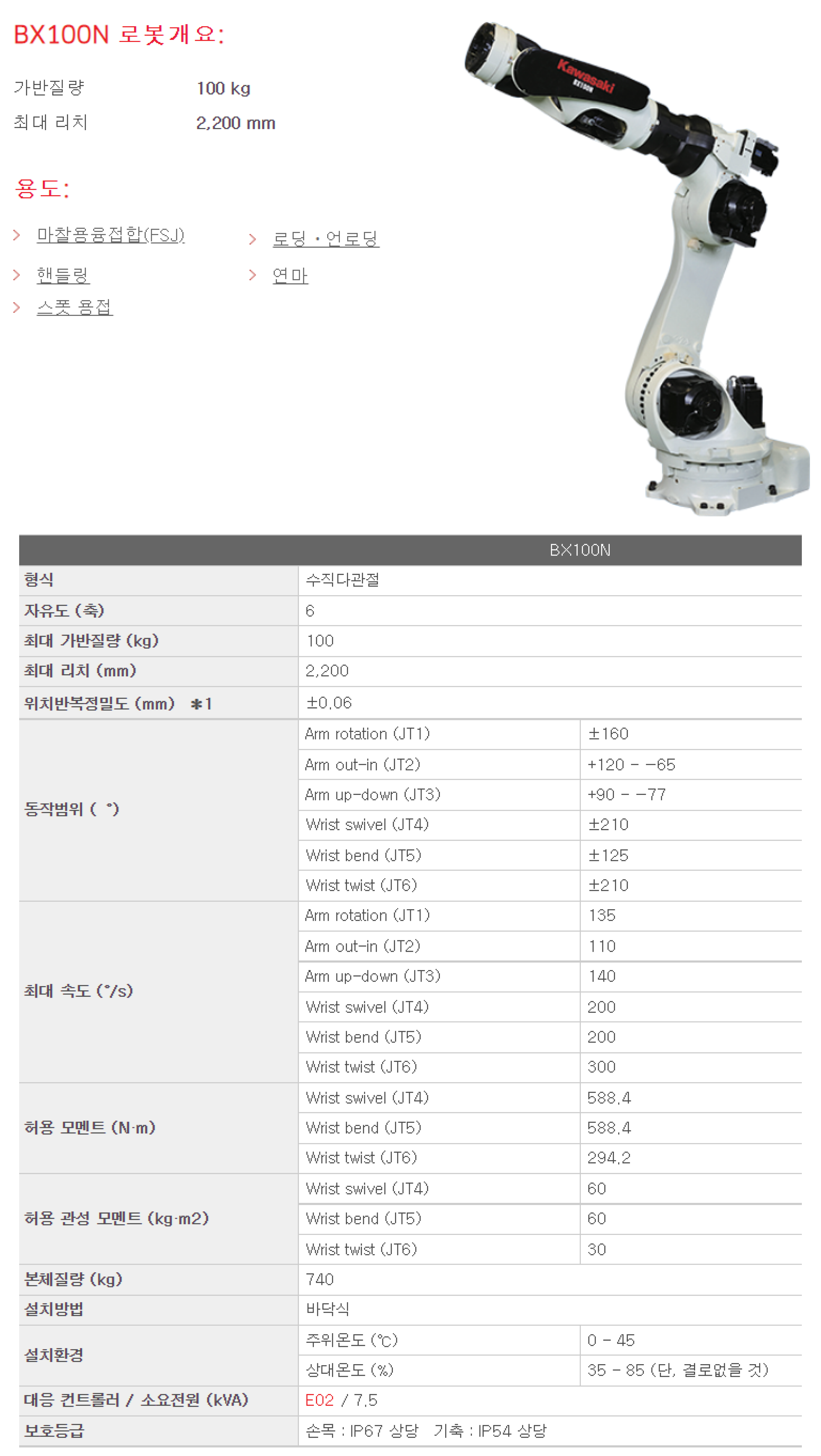 | 상품명(모델명) | Kawasaki 스폿용접용 BX100N (Payload : 100 kg , Reach: 2,200 mm) | ||