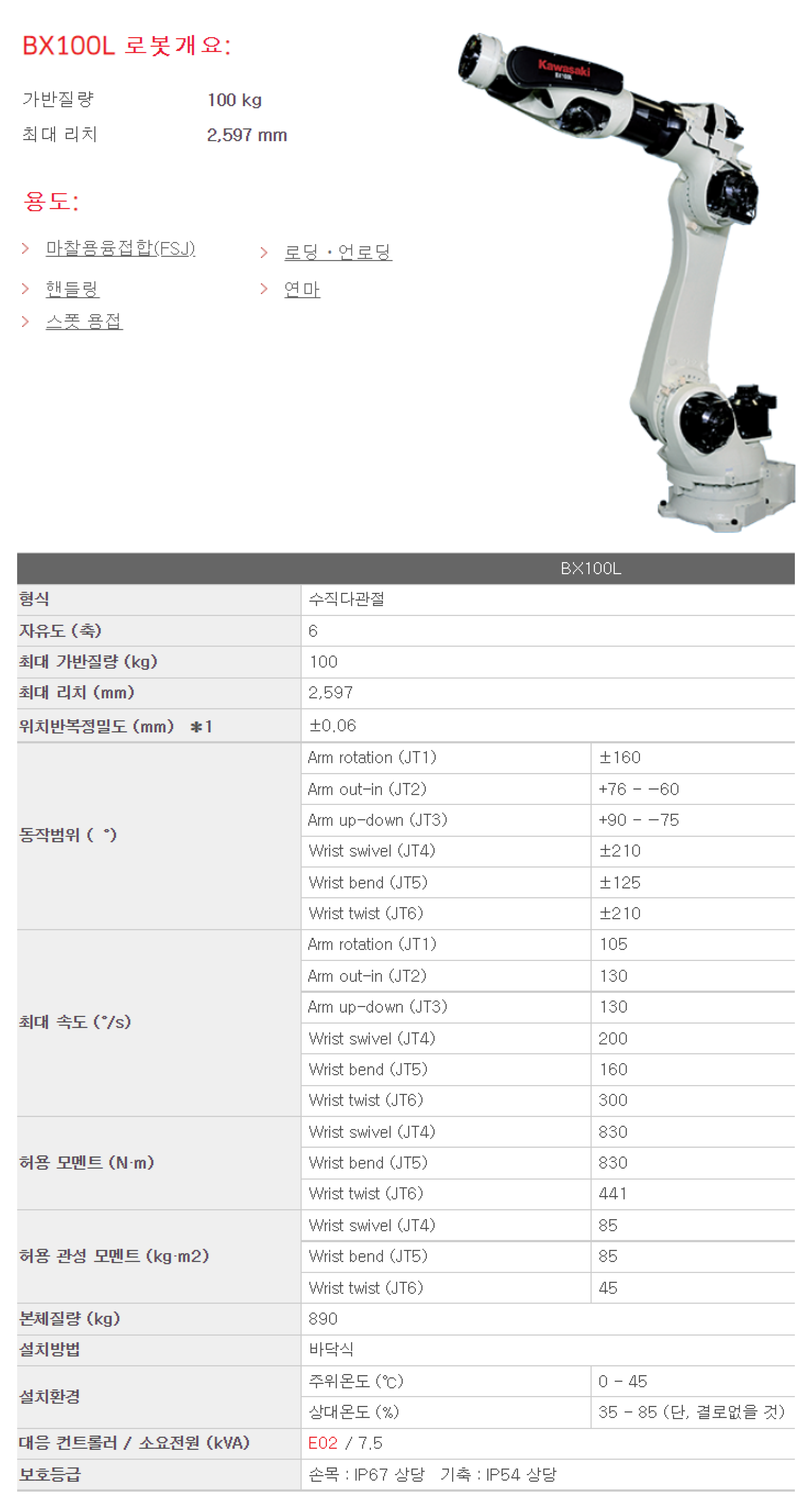 | 상품명(모델명) | Kawasaki 스폿용접용 BX100L (Payload : 100 kg , Reach: 2,597 mm) | ||