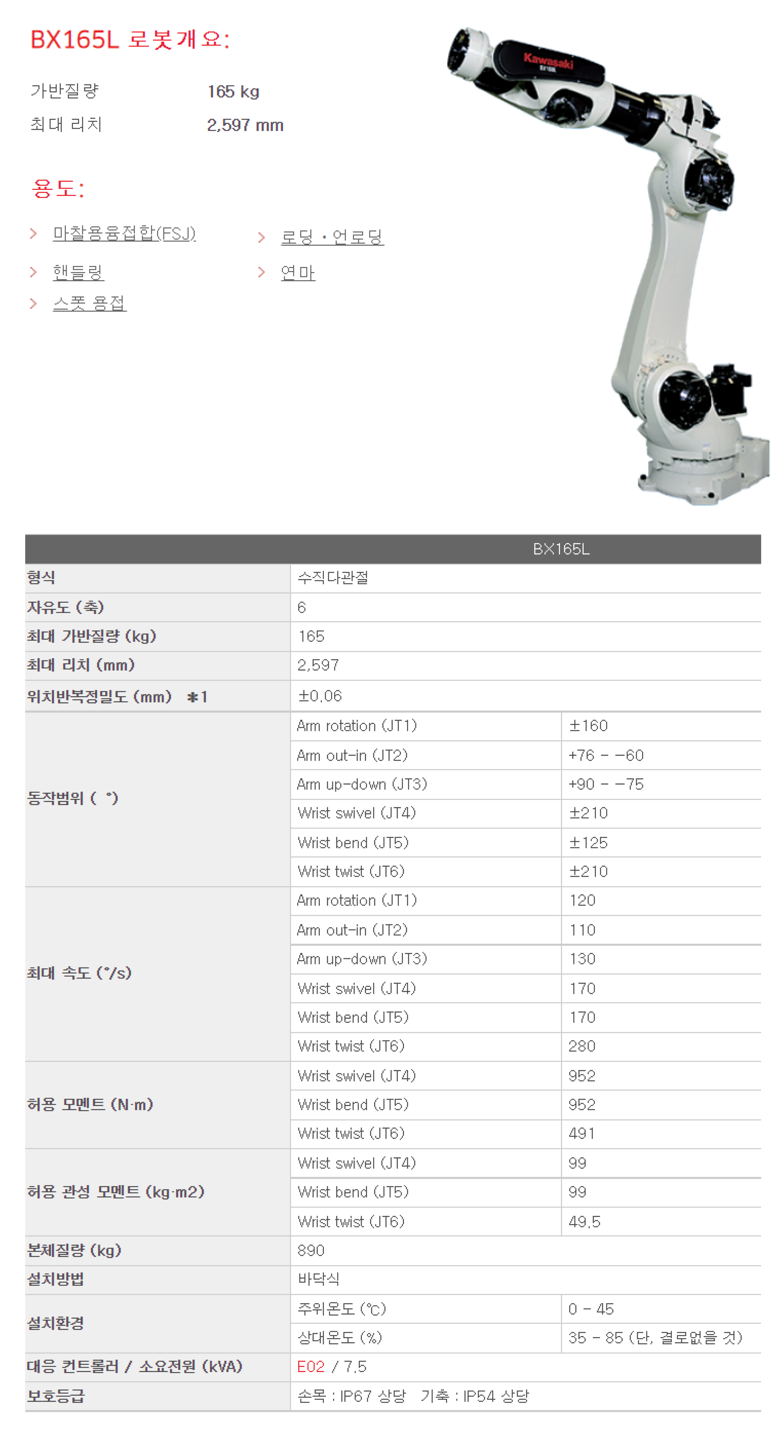 | 상품명(모델명) | Kawasaki 스폿용접용 BX165L (Payload : 165 kg , Reach: 2,597 mm) | ||