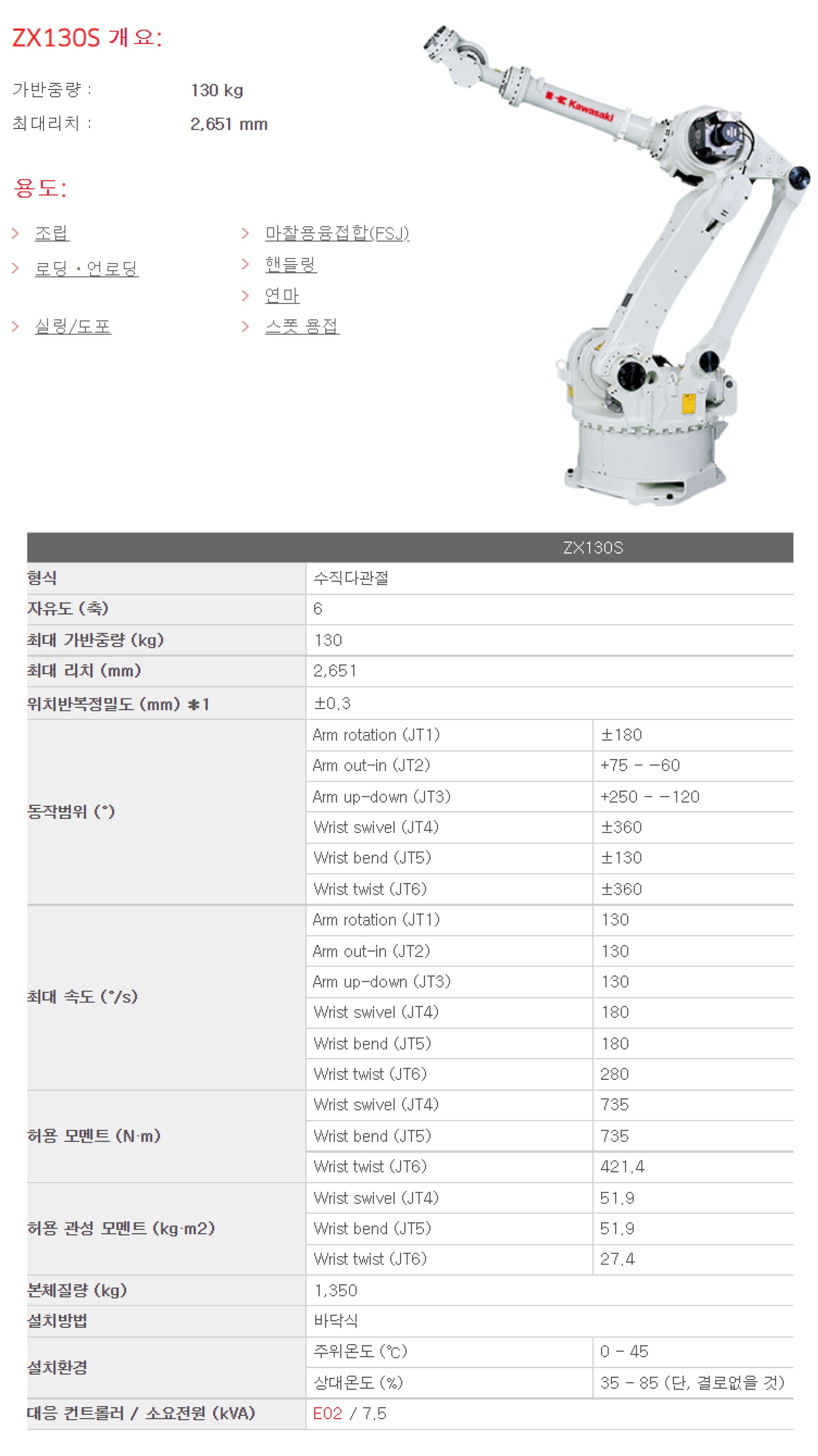 | 상품명(모델명) | Kawasaki 대형 범용 산업용로봇 ZX130S (Payload : 130 kg , Reach: 2,651 mm) | ||