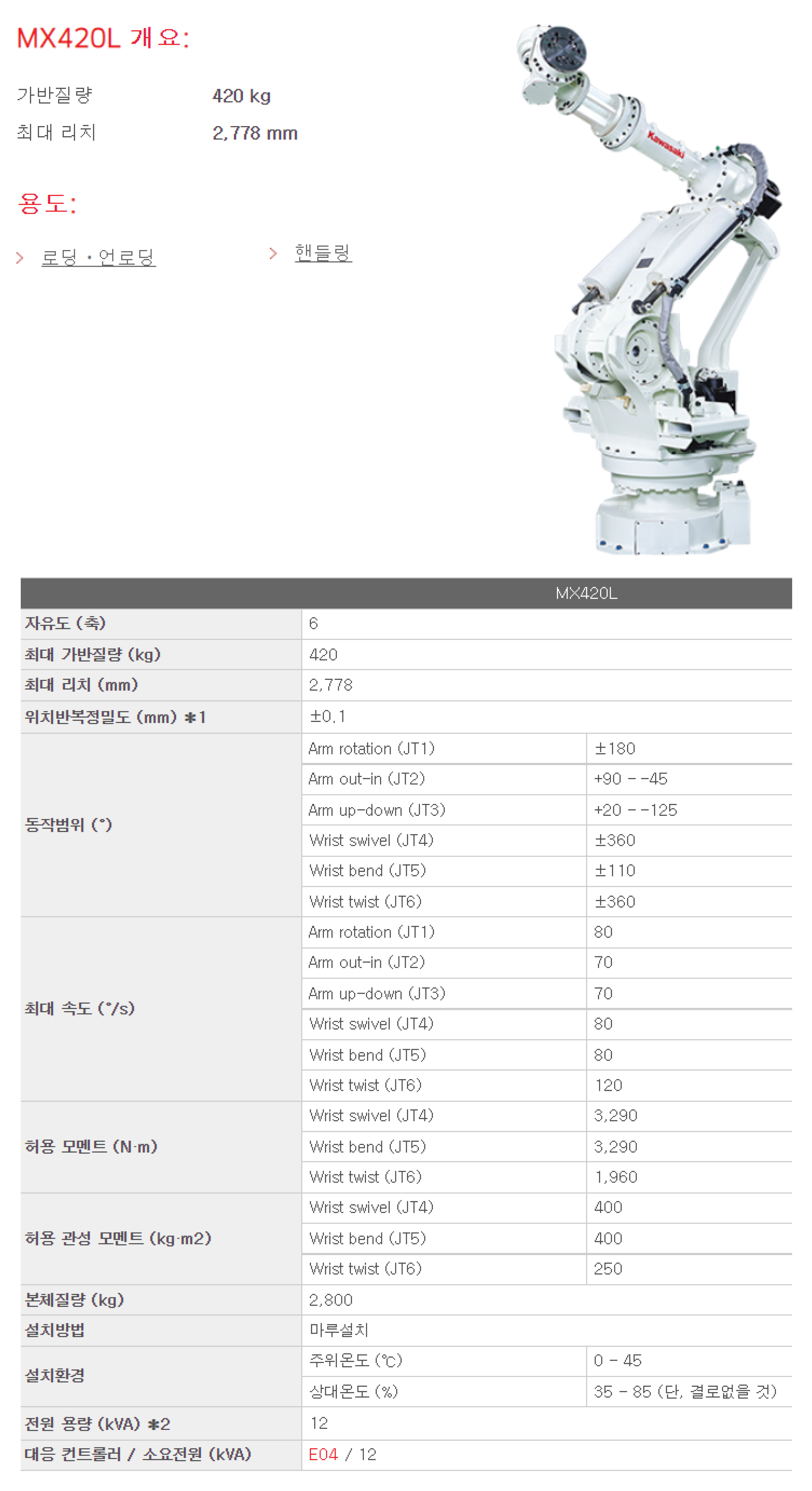 | 상품명(모델명) | Kawasaki 초대형 범용 산업용로봇 MX420L (Payload : 420 kg , Reach: 2,778 mm) | ||