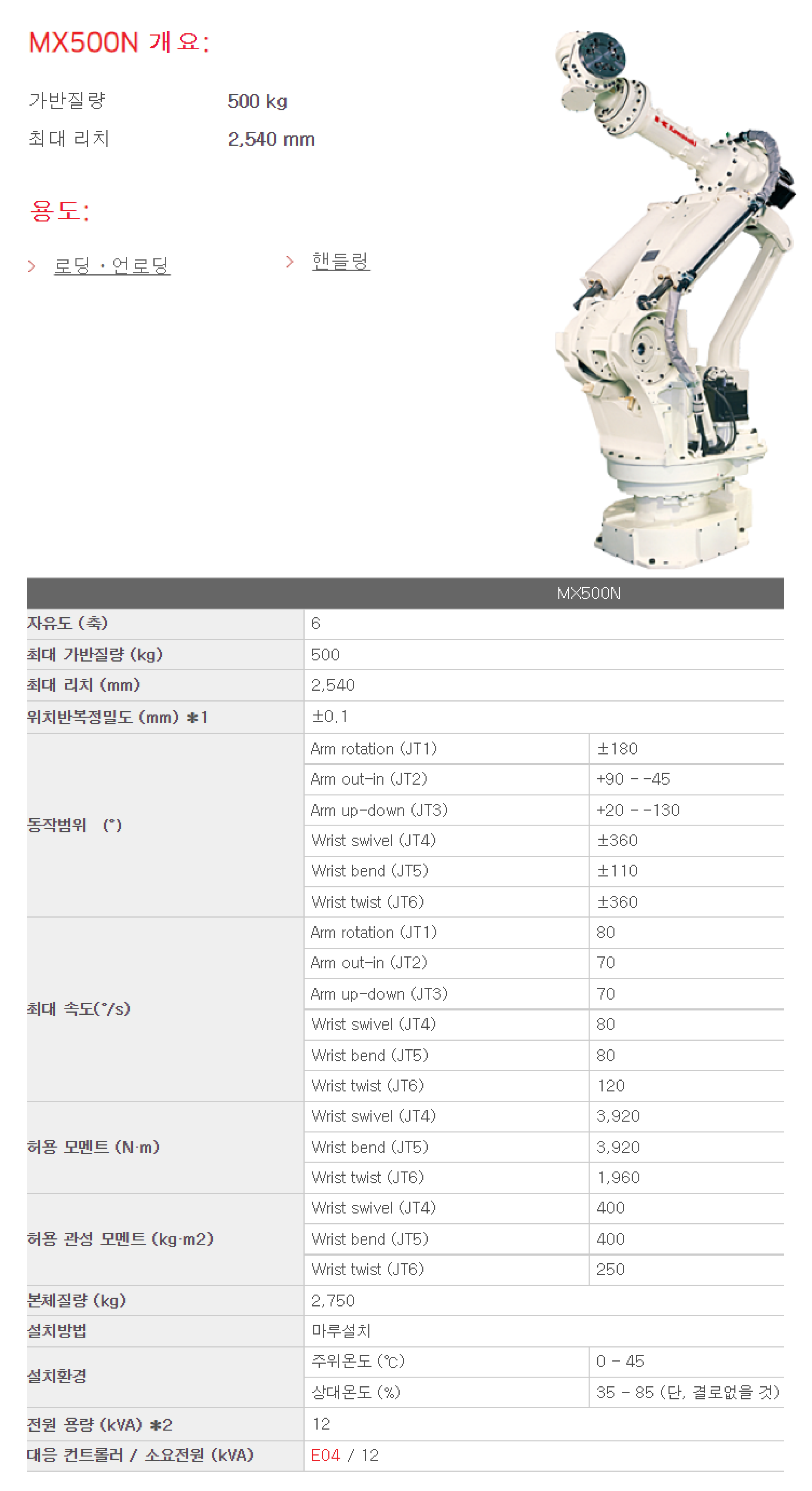 | 상품명(모델명) | Kawasaki 초대형 범용 산업용로봇 MX500N (Payload : 500 kg , Reach: 2,540 mm) | ||