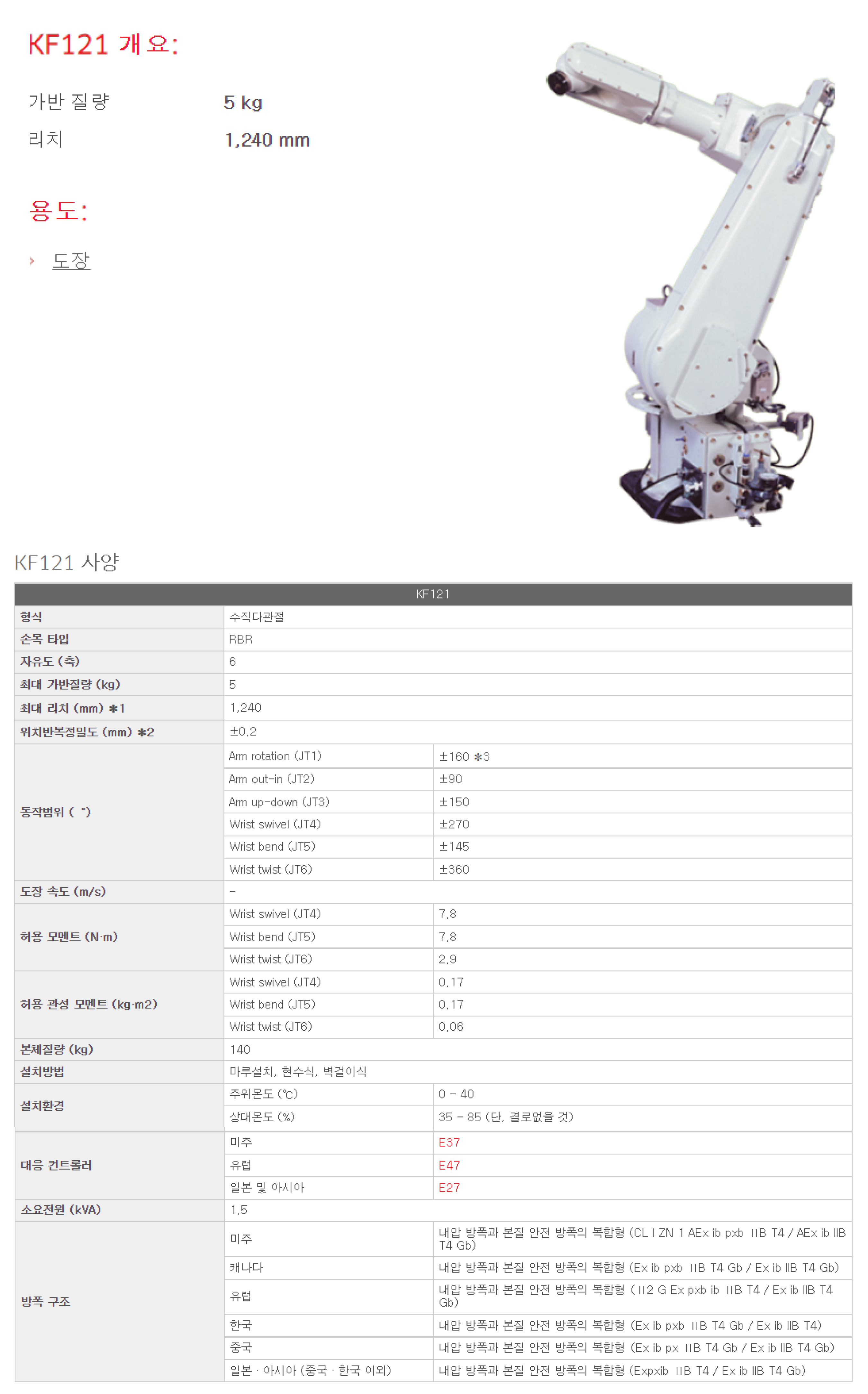 | 상품명(모델명) | Kawasaki 방폭도장로봇 KF121 (Payload : 5 kg , Reach: 1,240 mm) | ||