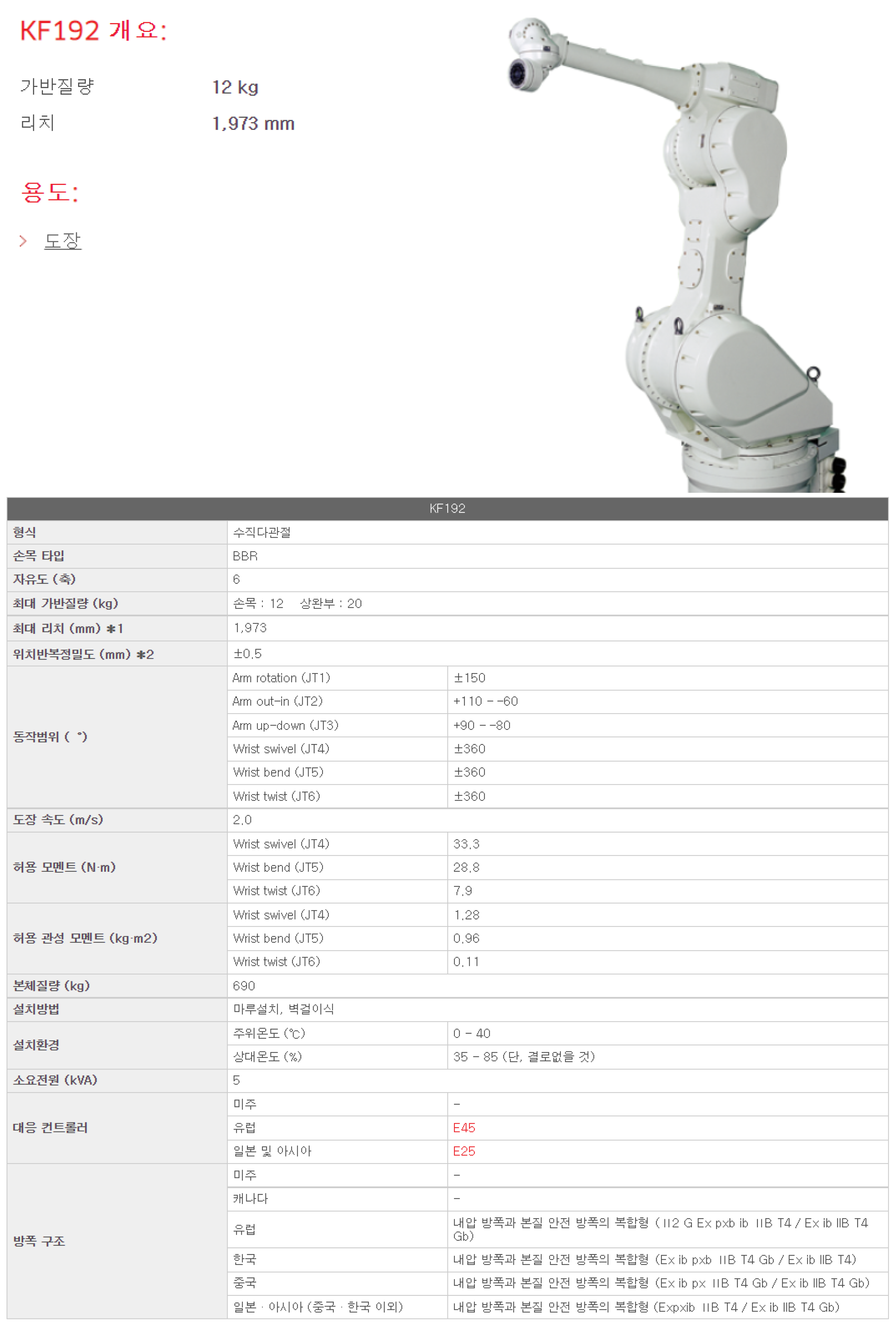 | 상품명(모델명) | Kawasaki 방폭도장로봇 KF192 (Payload : 12 kg , Reach: 1,973 mm) | ||
