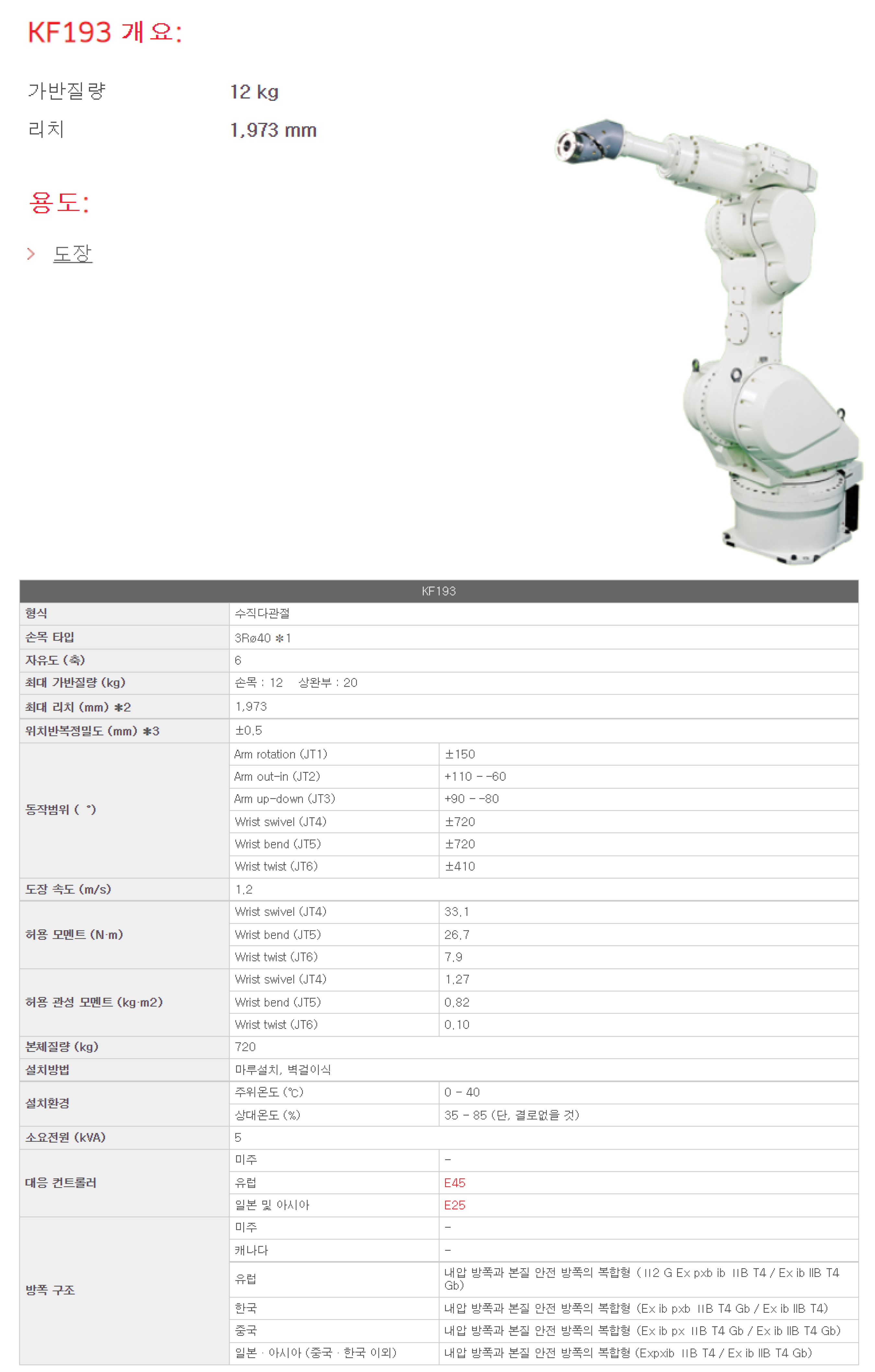 | 상품명(모델명) | Kawasaki 방폭도장로봇 KF193 (Payload : 12 kg , Reach: 1,973 mm) | ||