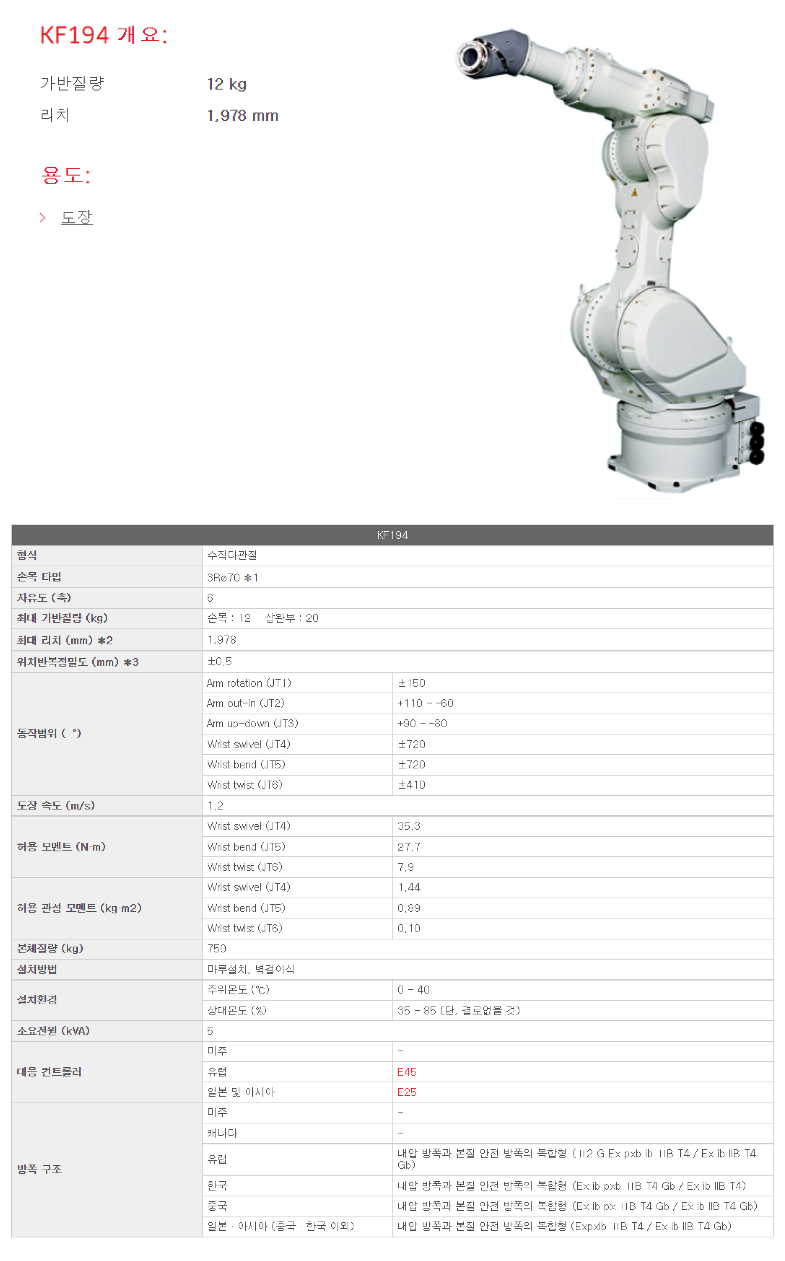 | 상품명(모델명) | Kawasaki 방폭도장로봇 KF194 (Payload : 12 kg , Reach: 1,978 mm) | ||