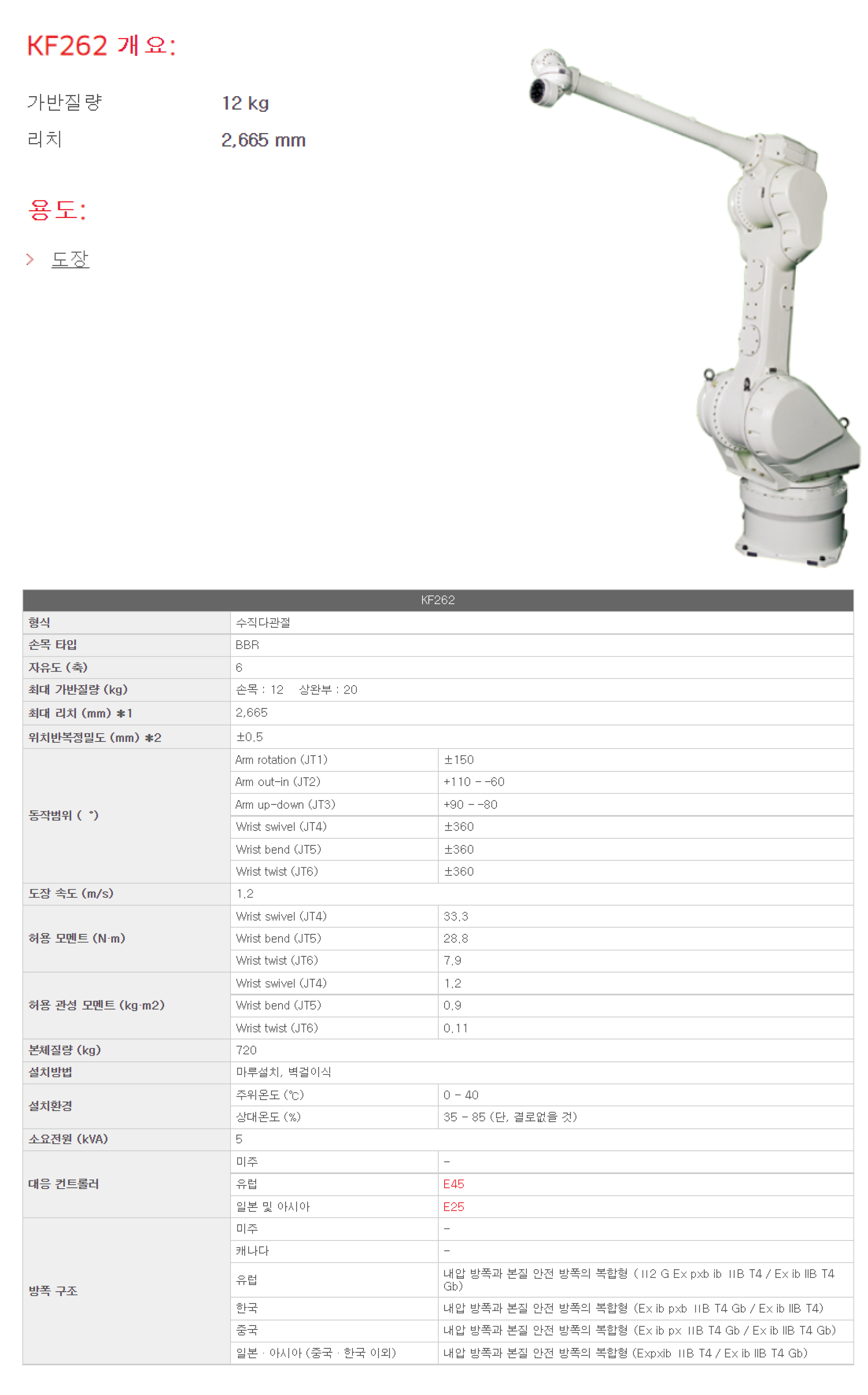 | 상품명(모델명) | Kawasaki 방폭도장로봇 KF262 (Payload : 12 kg , Reach: 2,665 mm) | ||