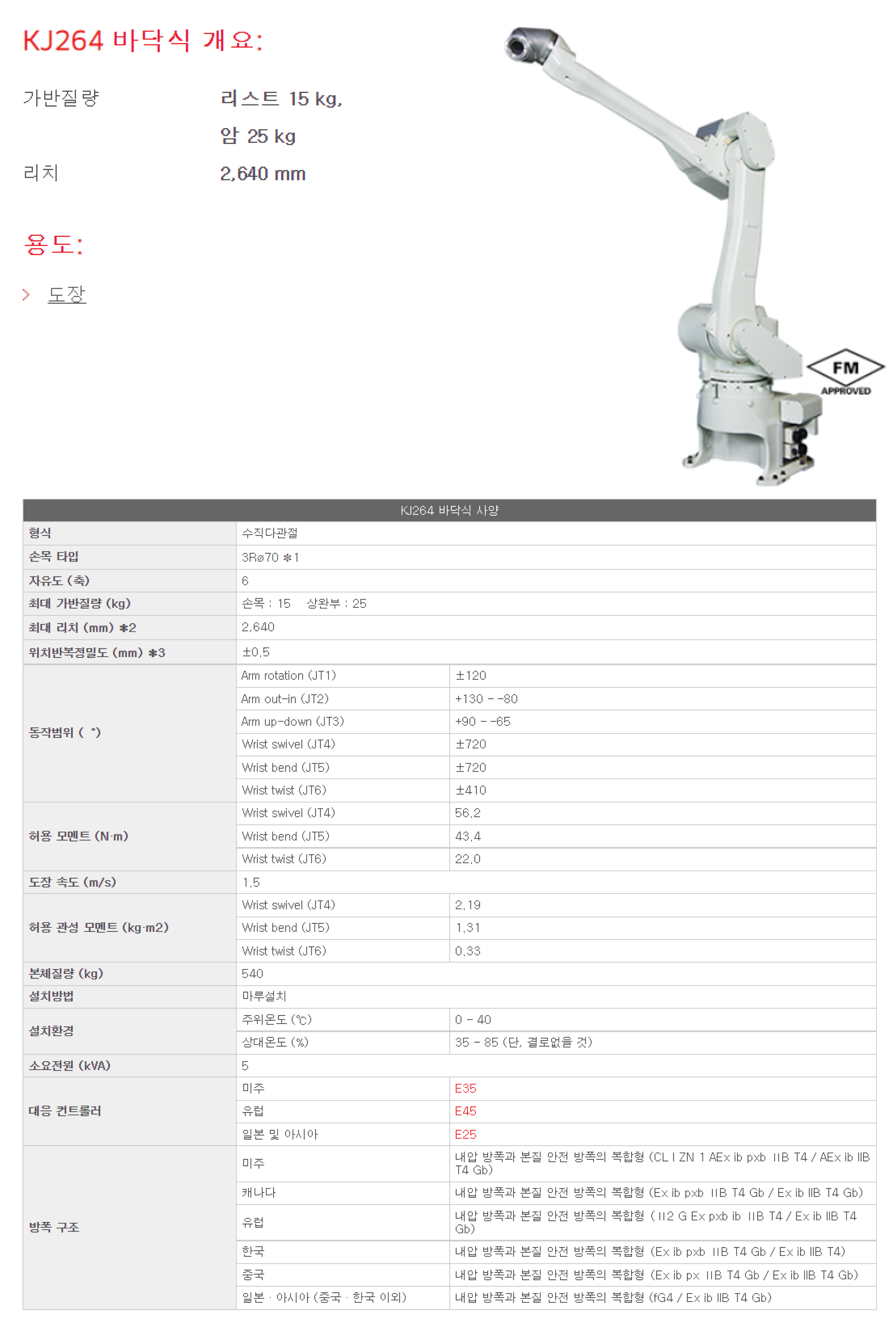 | 상품명(모델명) | Kawasaki 방폭도장로봇 KJ264 (Payload : 15 kg , Reach: 2,640 mm) | ||