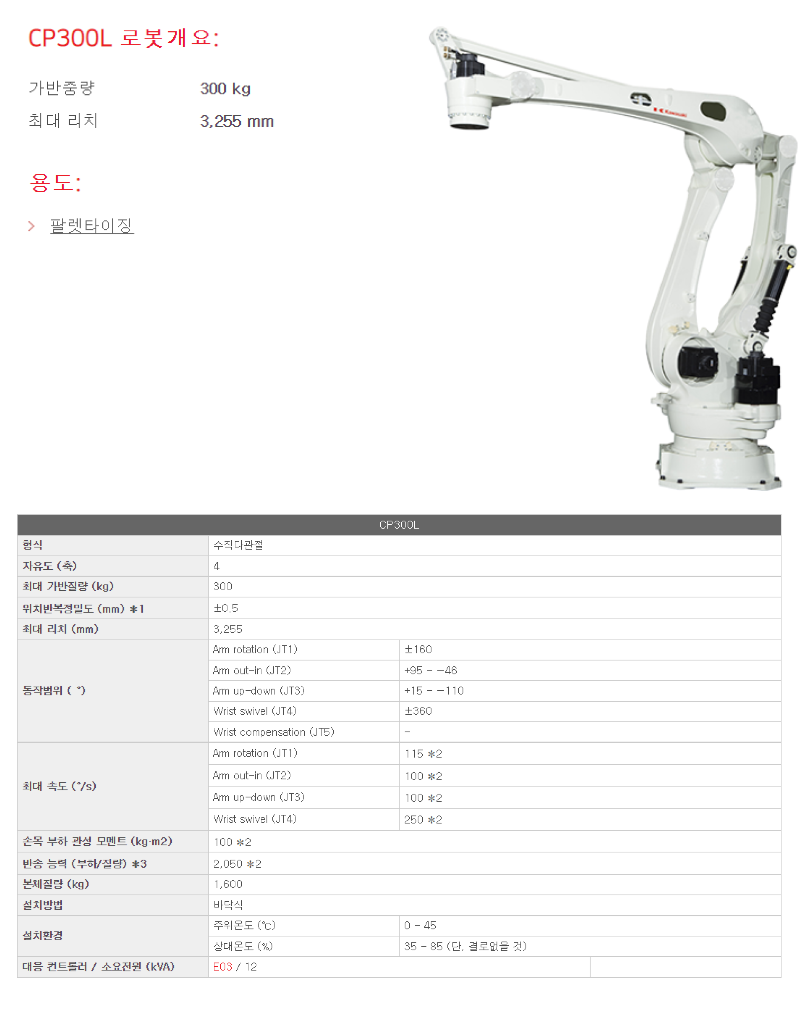 | 상품명(모델명) | Kawasaki 팔렛타이징 로봇 CP300L (Payload : 300 kg , Reach: 3,255 mm) | ||