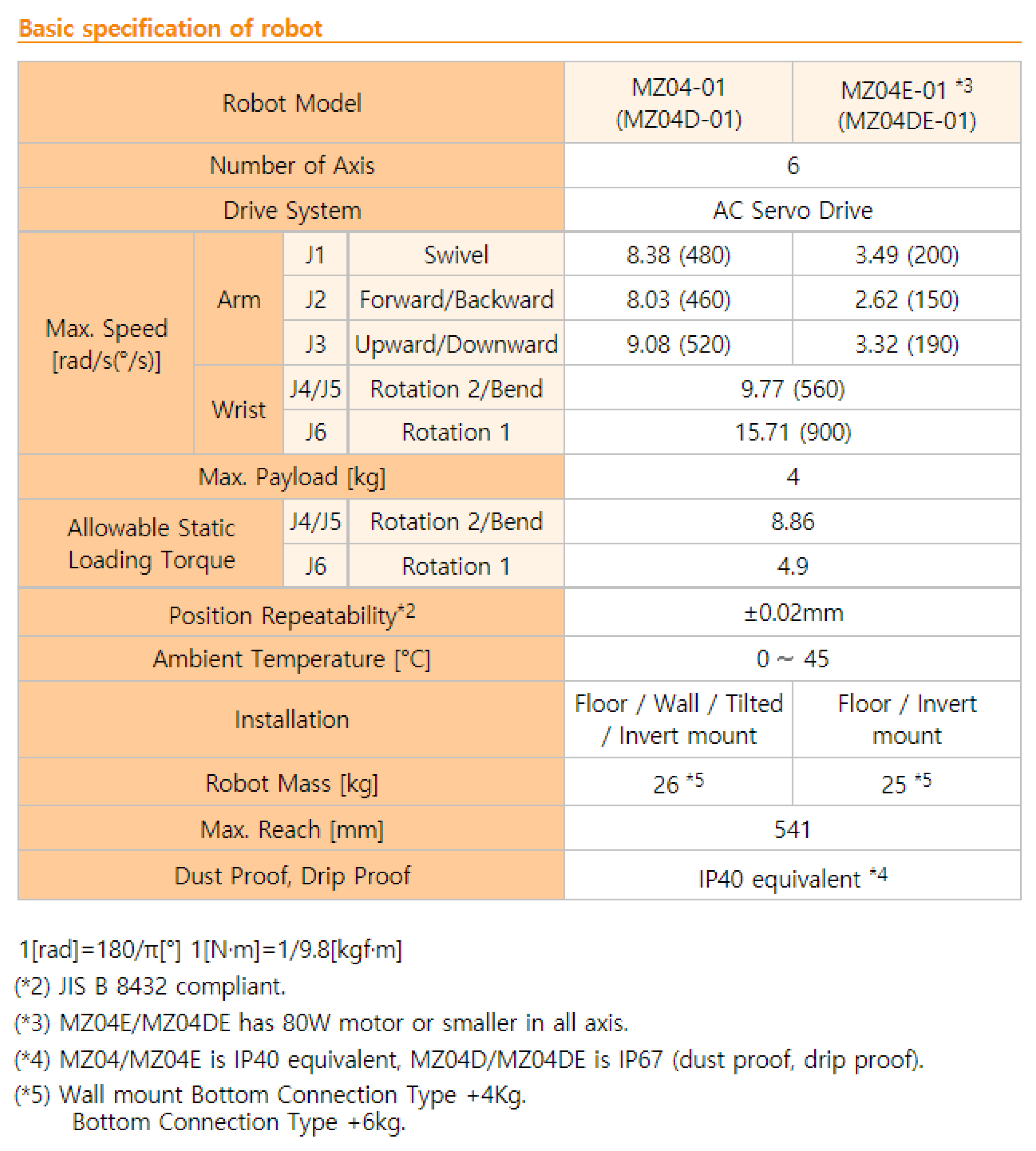 | 상품명(모델명) | NACHI MZ04E (Payload : 4kg Reach : 541 mm) | ||