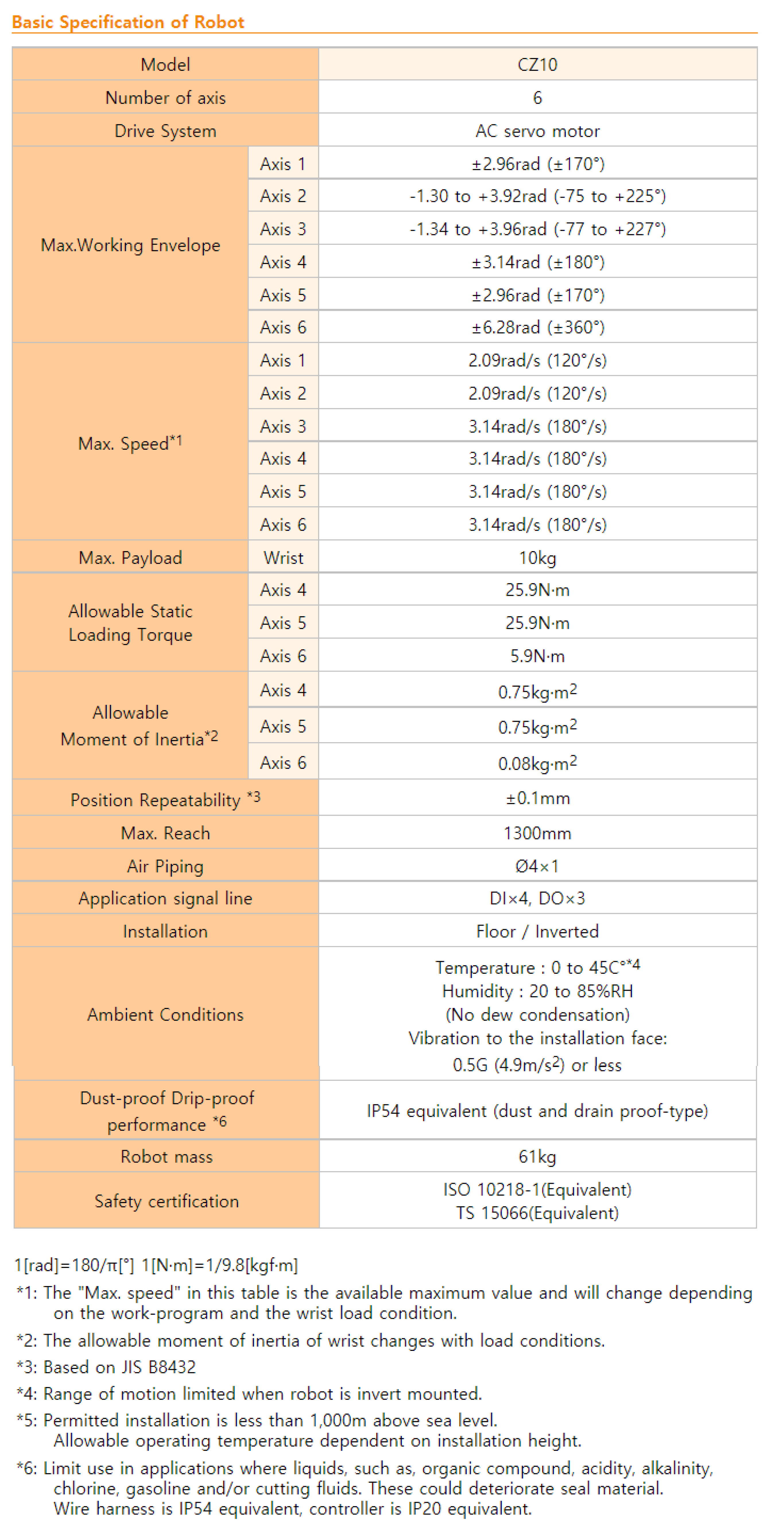 | 상품명(모델명) | NACHI CZ10 (Payload : 10kg Reach : 1,300 mm) | ||