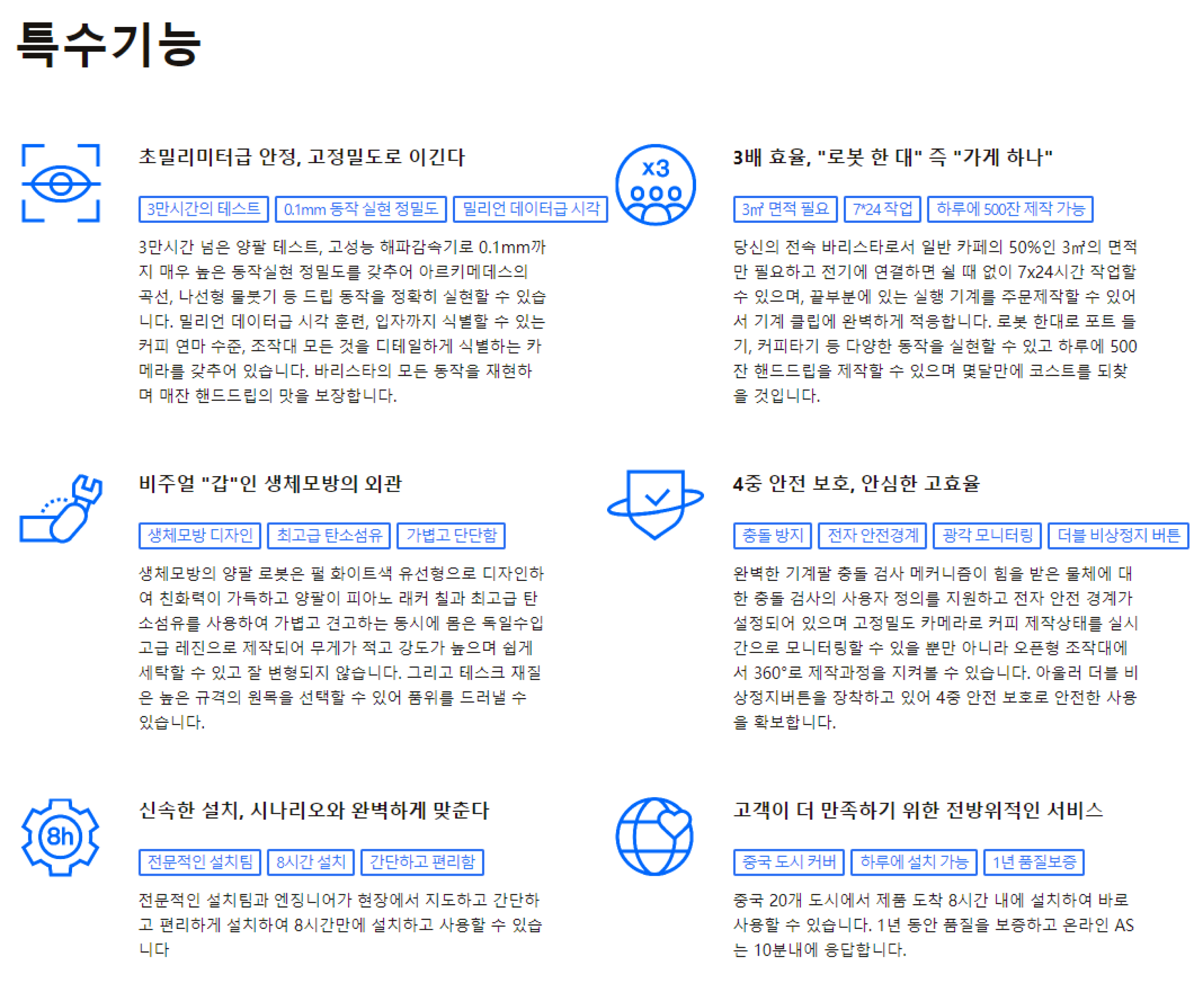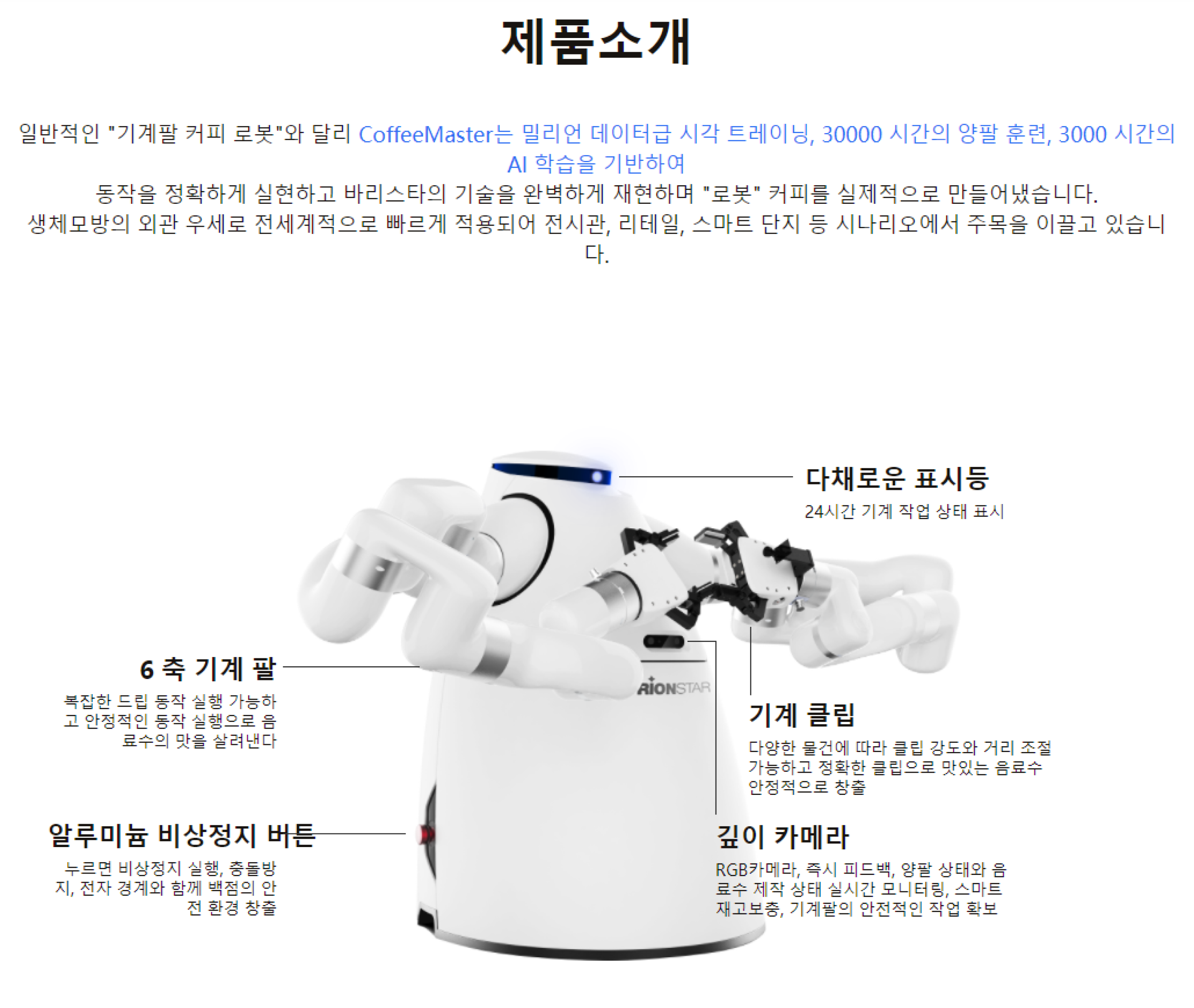 CoffeeMaster는 밀리언 데이터급 시각 트레이닝, 30000 시간의 양팔 훈련, 3000 시간의 AI 학습을 기반하여 동작을 정확하게 실현하고 바리스타의 기술을 완벽하게 재현하며 "로봇" 커피를 실제적으로 만들어냈습니다.