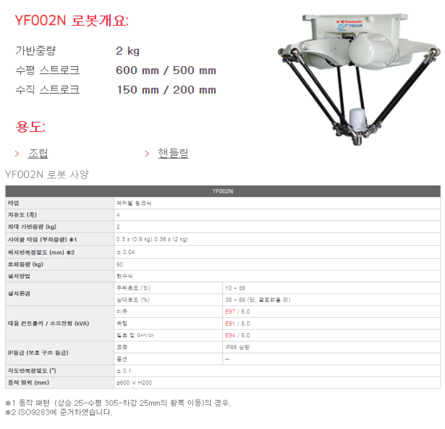 | 상품명(모델명) | Kawasaki 고속피킹로봇 YF002N (Payload : 2kg Reach : 600 mm) | ||