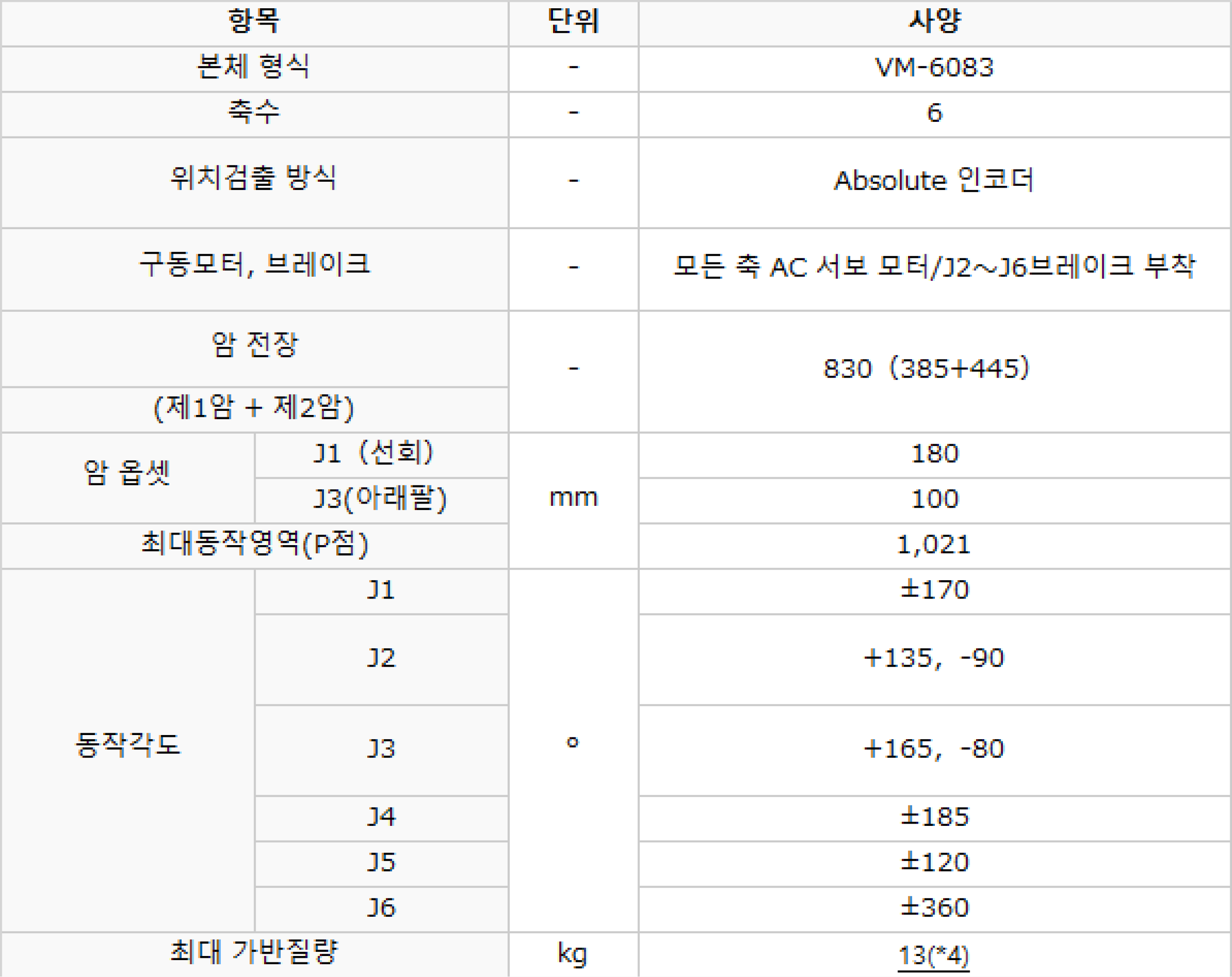 | 상품명(모델명) | DENSO VM-6083 (Payload : 13kg, Reach : 1021mm) | ||
